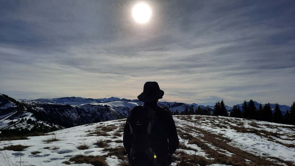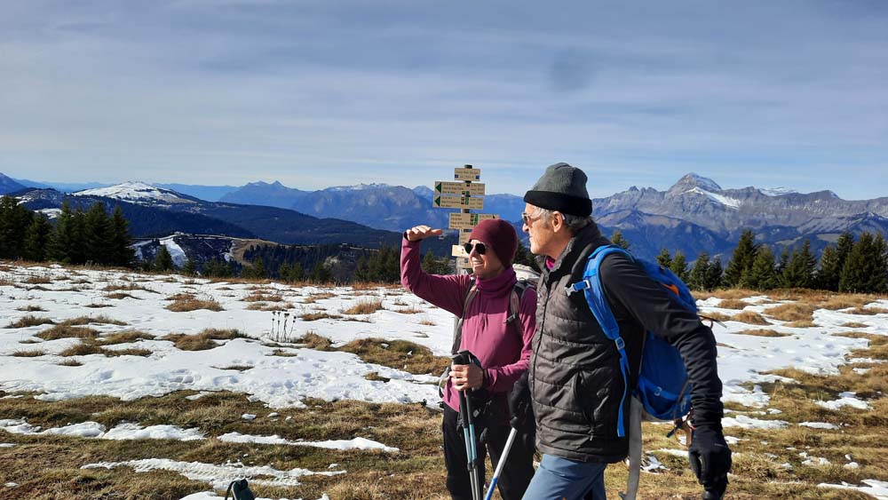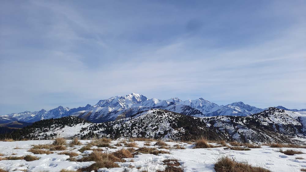 Courte balade dans le Nord du massif des Saisies, un coin que tout le monde ne connaît pas, mais qui offre une large vue à 360° depuis le massif du Mont Blanc jusqu'aux Bauges en passant par la Chartreuse. Nous avons tant profité du paysage que les prises de vue ont été rares. Montée depuis le plan Désert, au dessus de Notre Dame de Bellecombe, jusqu'à Ban Rouge une croupe herbeuse encore bien enneigée d'où nous découvrons ce paysage magnifique qui ne nous quittera pas de la journée.