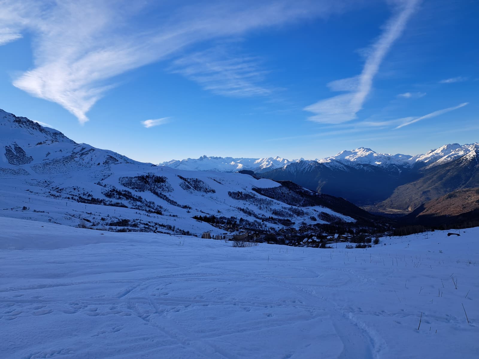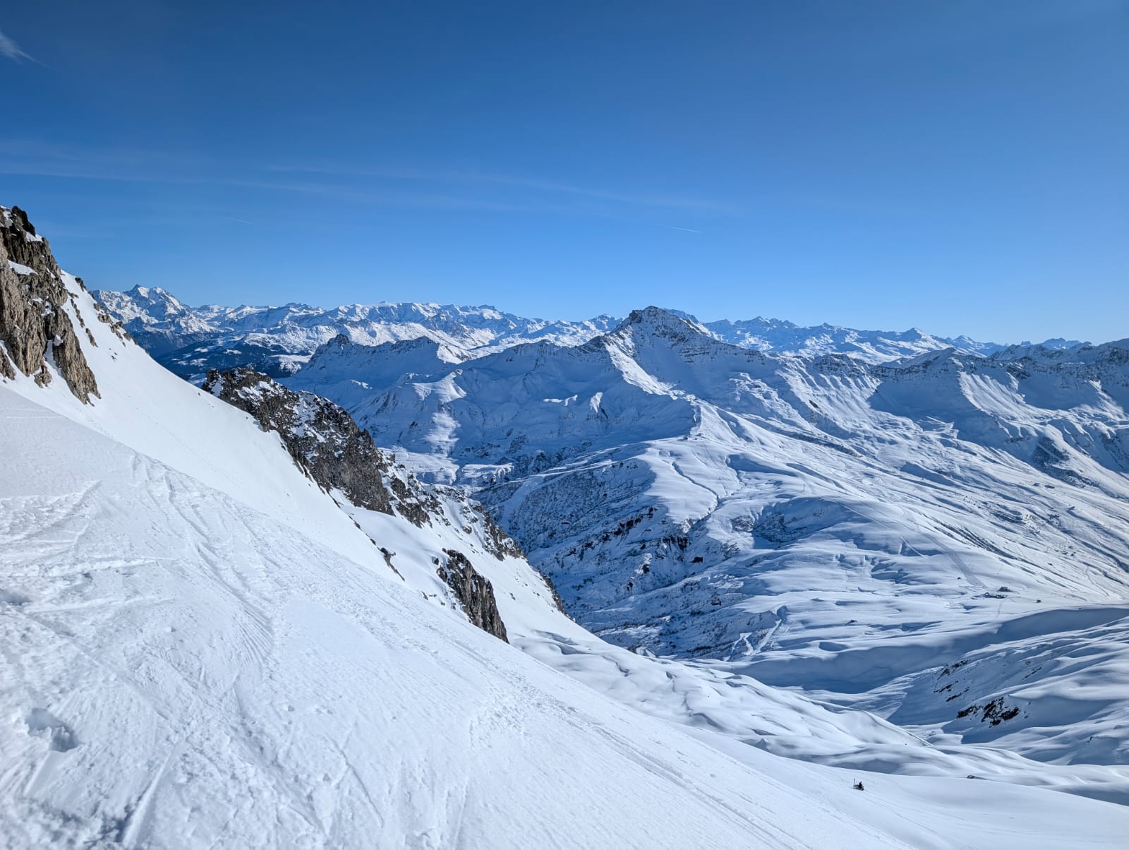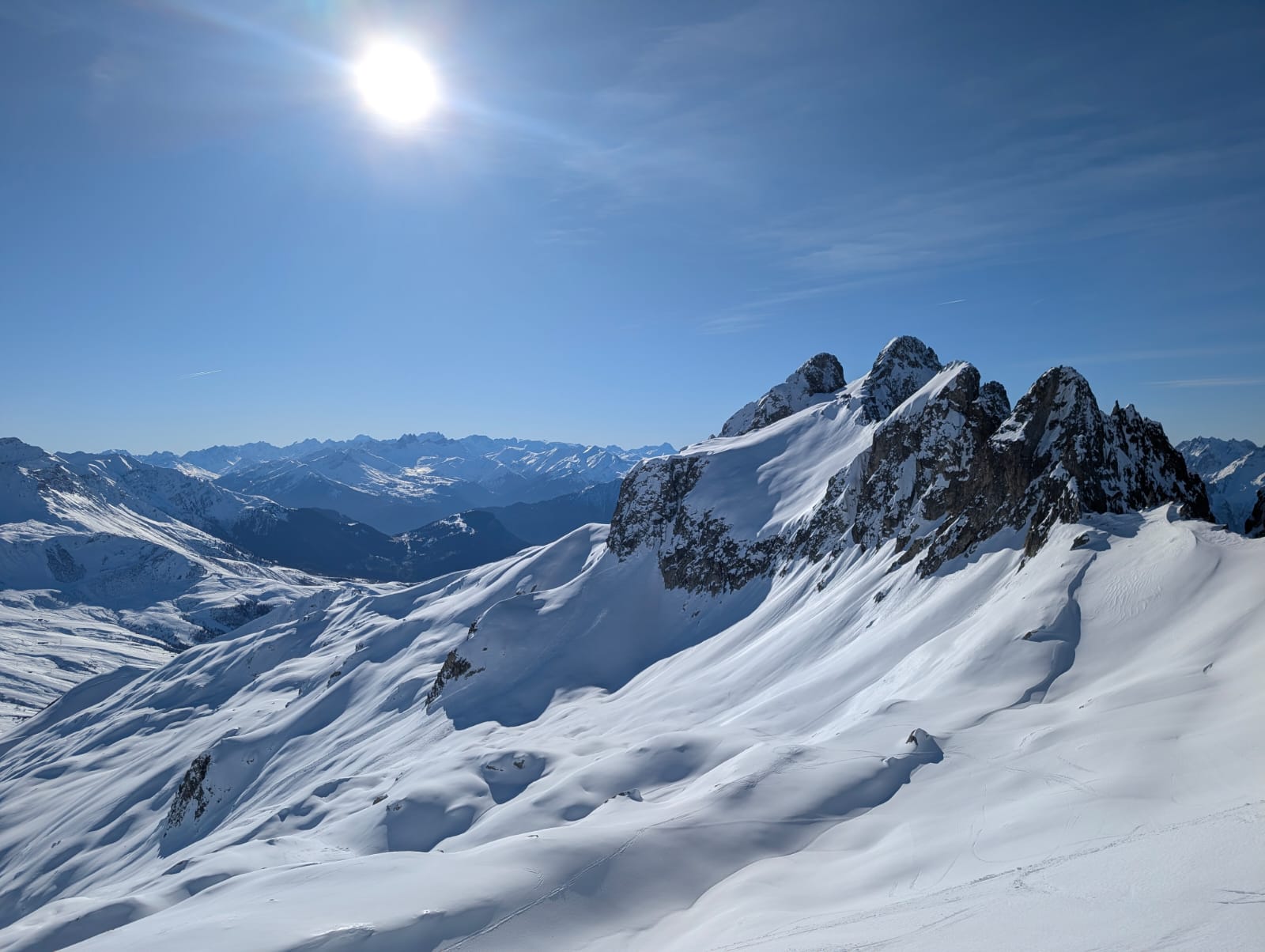 Au sommet, magnifique vue des 2 côtés : vallée de l'Arc et Cheval Noir. La fréquentation est encore modeste si bien que de belles pentes semblent pleines de promesses. Espérons qu'à 12h45, la neige ne soit pas trop ramollie.