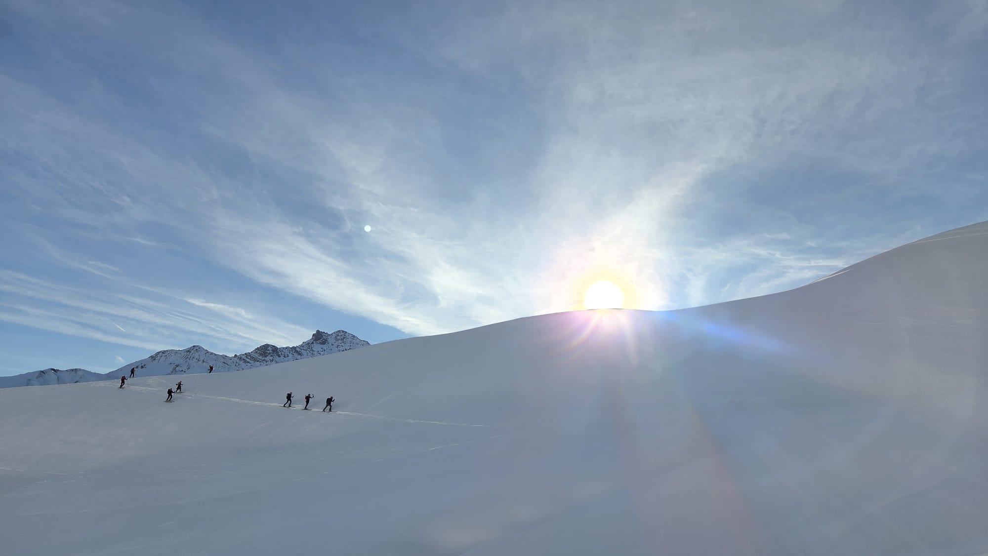 Mais à partir de là, le soleil ne nous quittera plus de la journée ! La montée se fait sur une neige bien dure : on met les couteaux pour le dernier quart. Plus sûr et plus cardio, mais on est là pour dépenser quelques calories ! L'avantage étant que la trace n'est pas trop difficile …