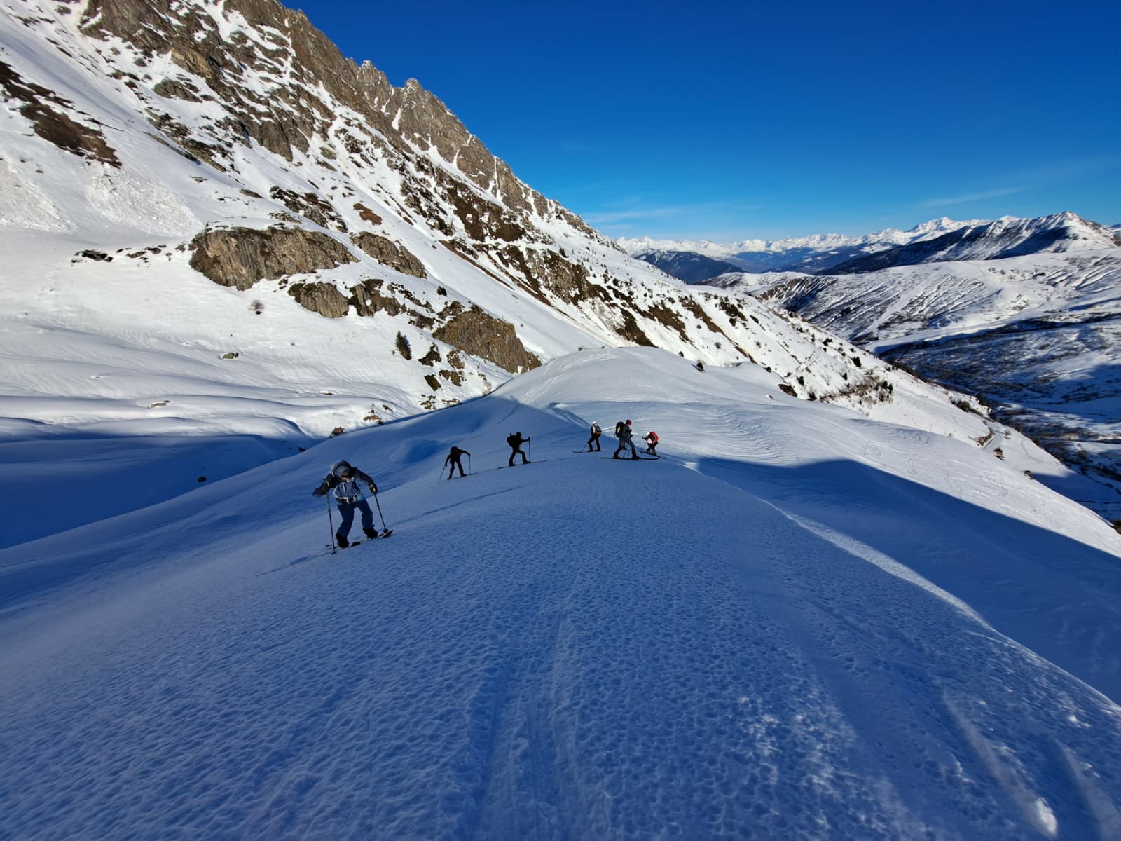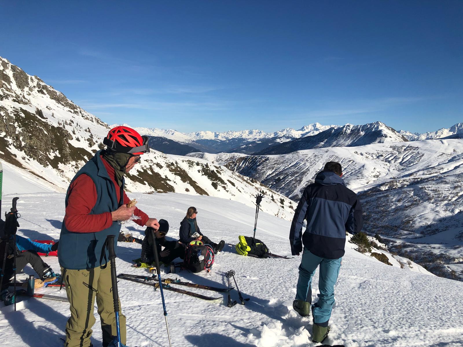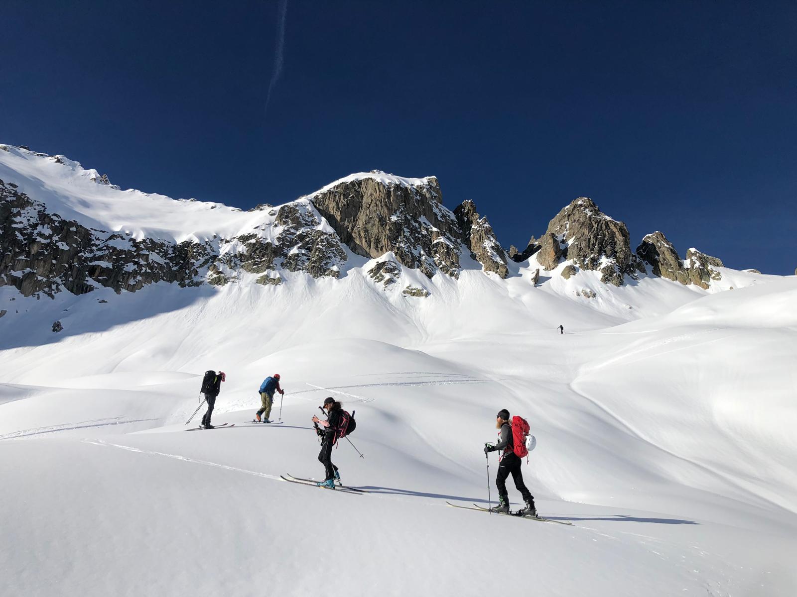 Les bons moments ayant toujours une fin, il nous faut repartir en re-peautant pour reprendre la centaine de mètres qui nous manquent et atteindre un bon point de départ pour la traversée descendante vers le col. Une occasion de refaire quelques conversions afin de bien finir la journée.