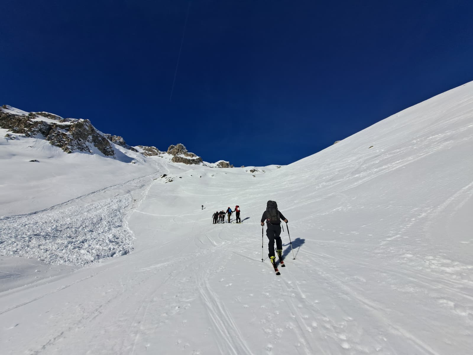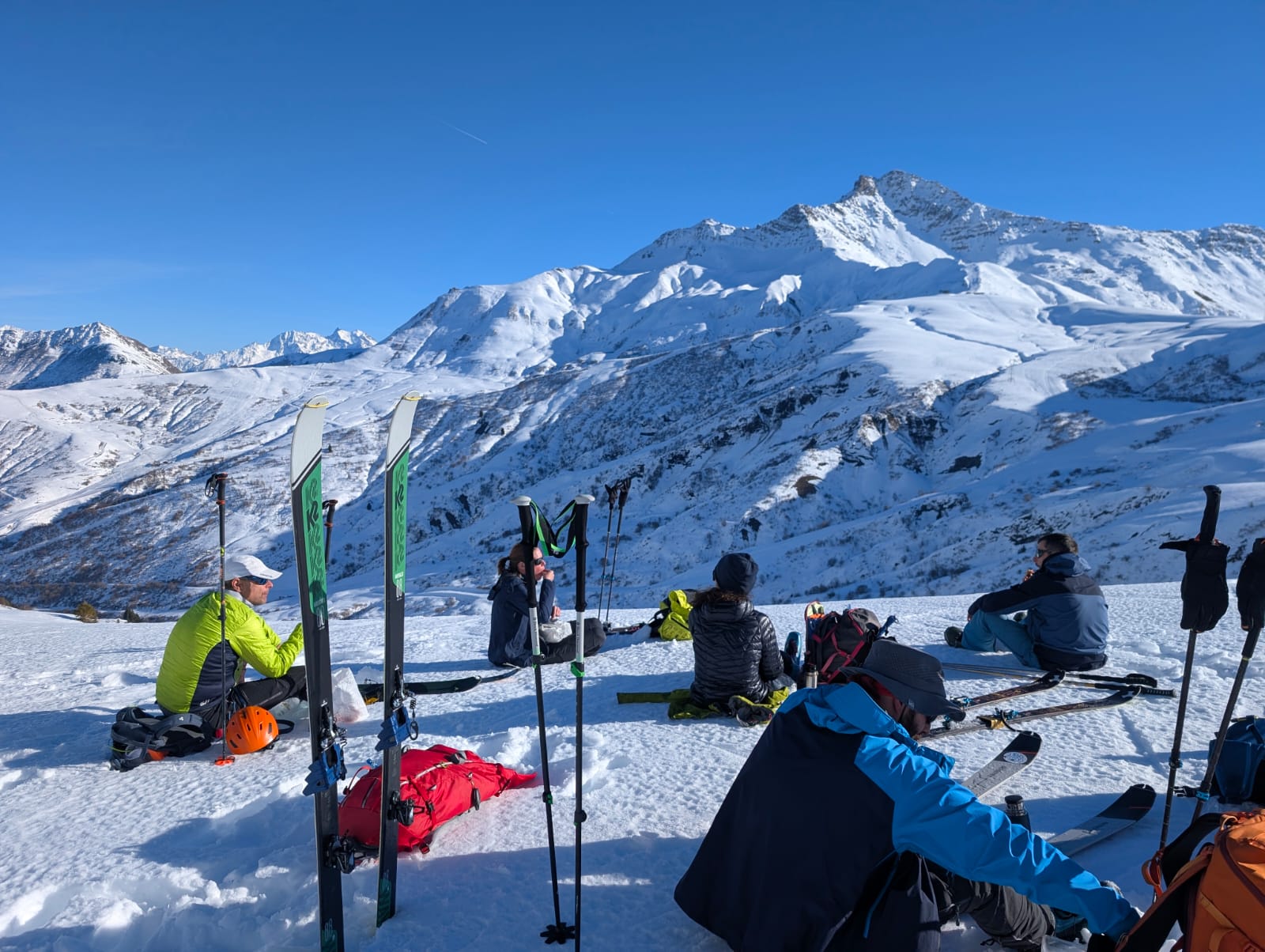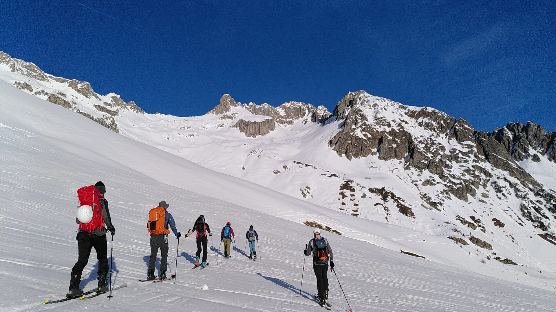 Les bons moments ayant toujours une fin, il nous faut repartir en re-peautant pour reprendre la centaine de mètres qui nous manquent et atteindre un bon point de départ pour la traversée descendante vers le col. Une occasion de refaire quelques conversions afin de bien finir la journée.