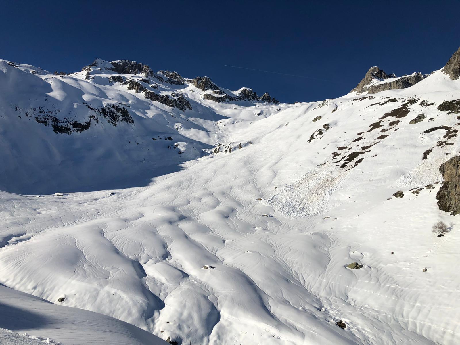 C'est parti ! Au final une petite moquette de 4-5 cm sur toutes les mini-croupes bien gelées et une neige plus transformée et molle dans les creux. Facile de s'orienter pour le maximum de plaisir. Tellement bien que personne n'a sorti son appareil pour immortaliser ces quelques super minutes.