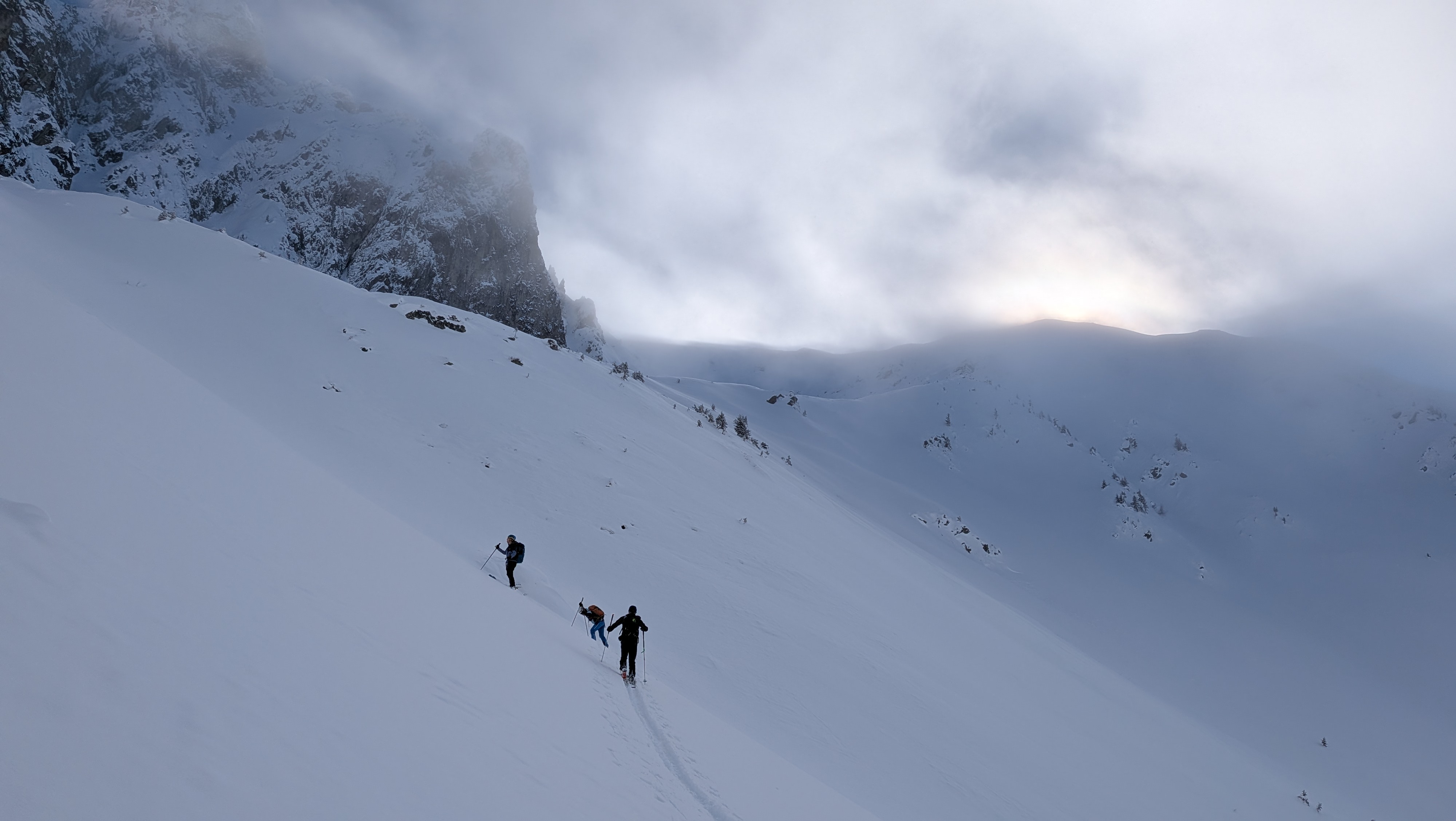 Au final, un compromis est trouvé un peu en dessous de 1900m, juste avant la forêt. On remet les peaux, car il commence à se faire un peu tard et surtout la mer de nuage à tendance à monter.