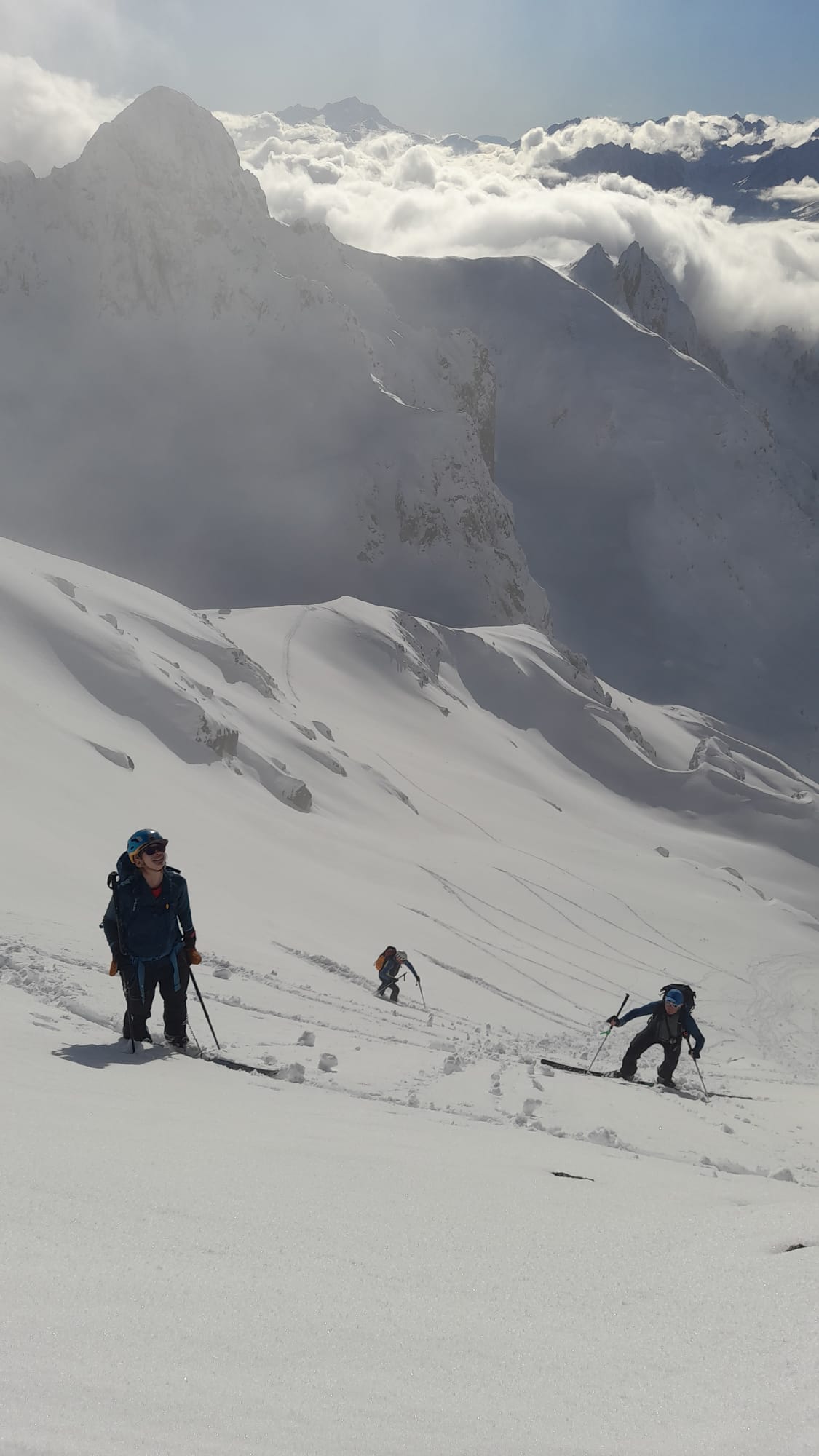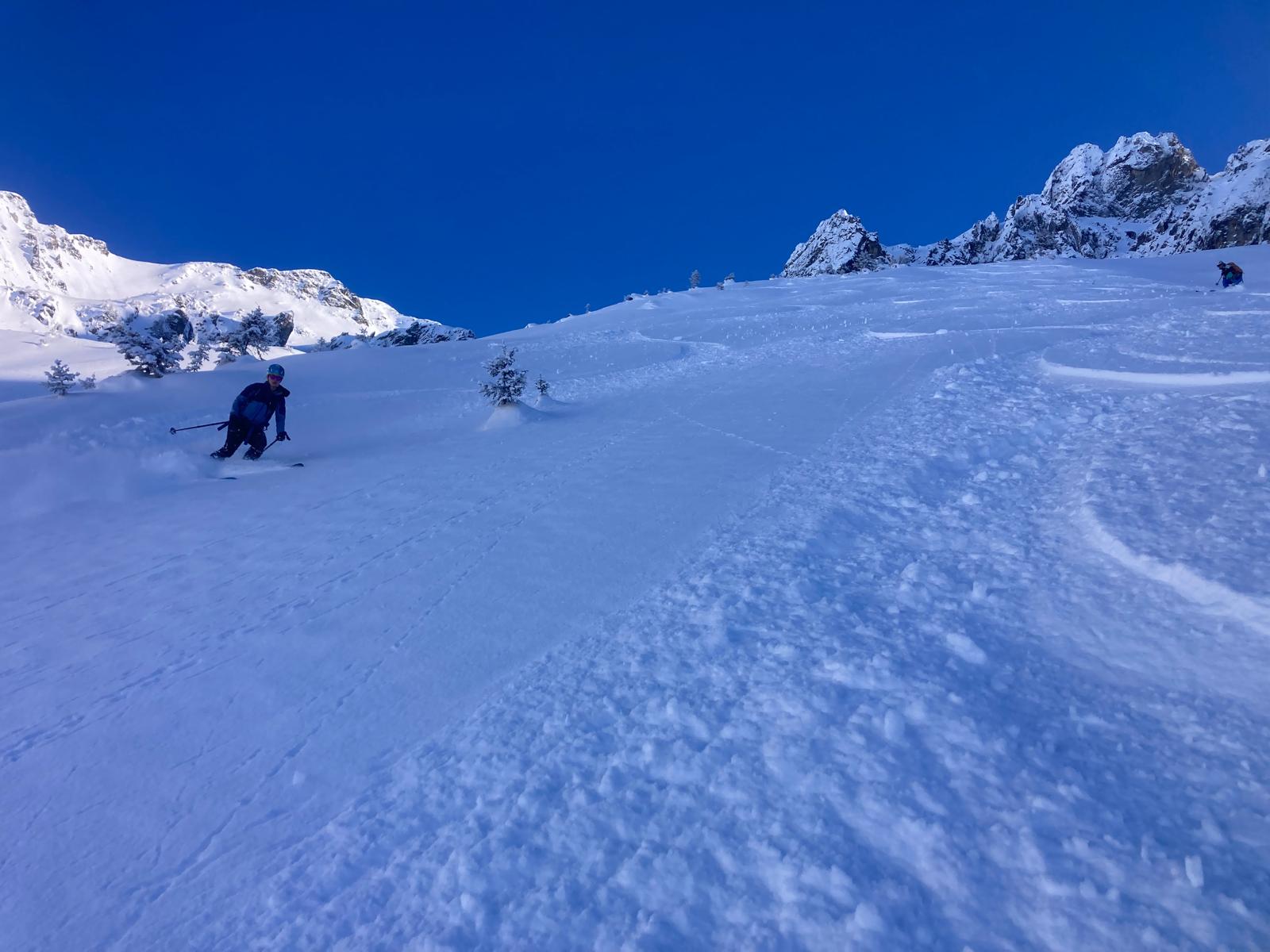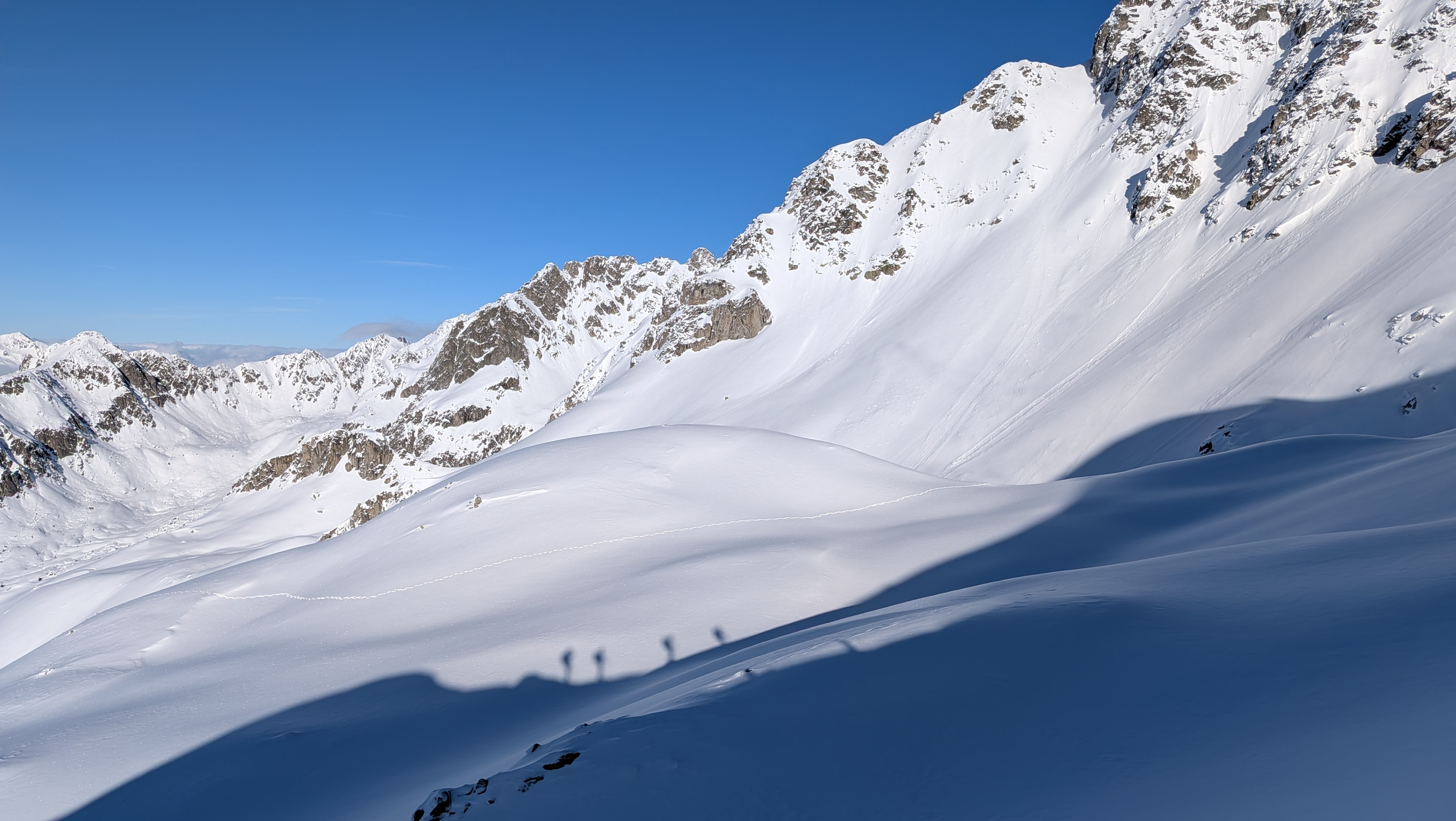 Claire insiste : c'est direction le sommet et c’est une bonne chose, car on décide de descendre droit dans la pente nord-ouest. Alice avait repéré quelqu’un sur Skitour qui l’avait faite récemment. Après une petite descente en escalier entre les rochers, on trouve une large pente bien raide avec de la bonne poudre, juste un peu cartonnée par endroit.