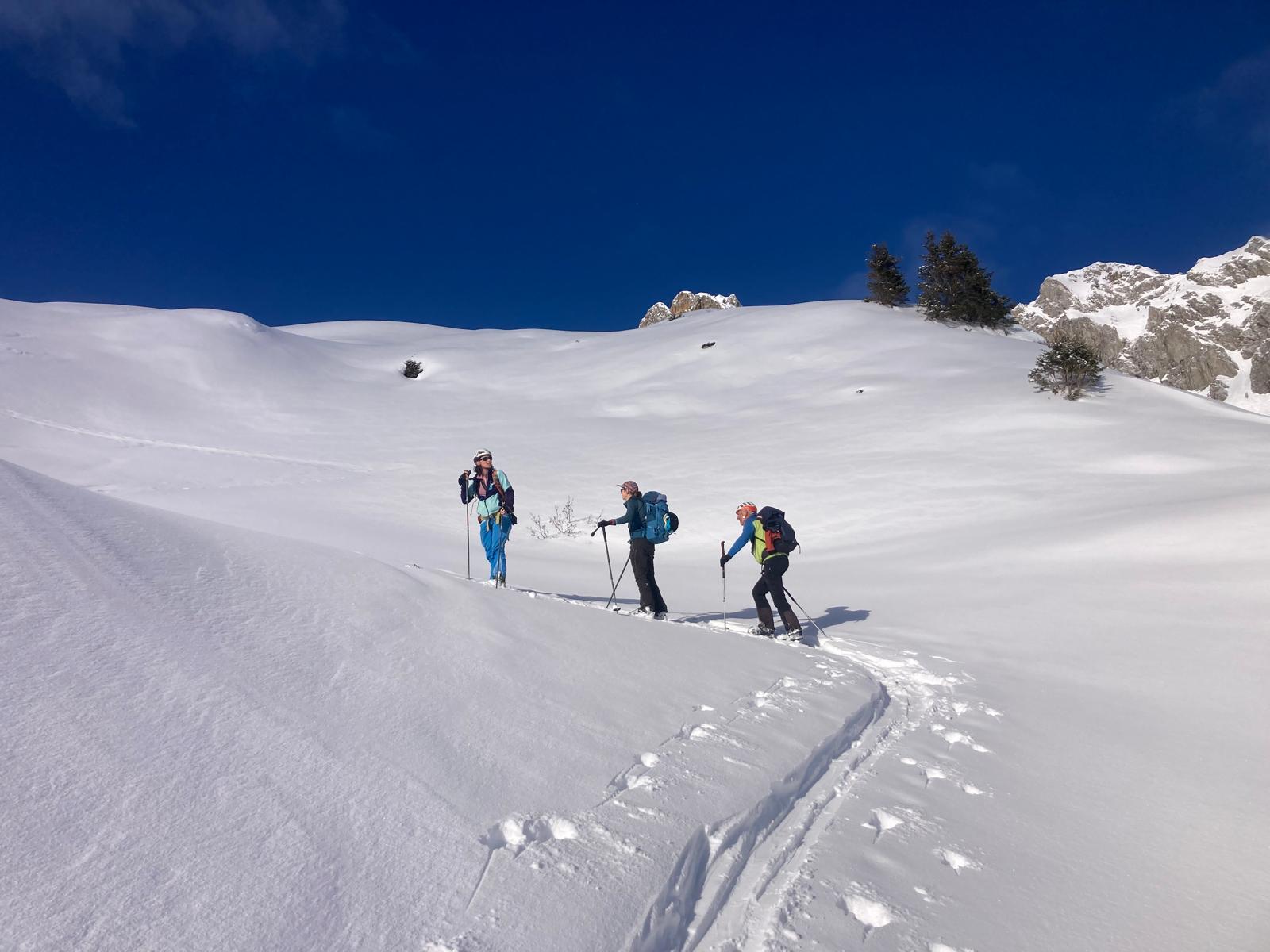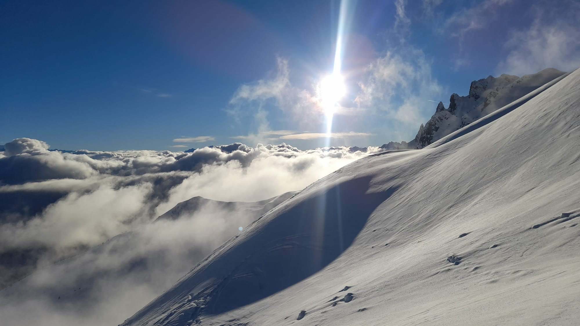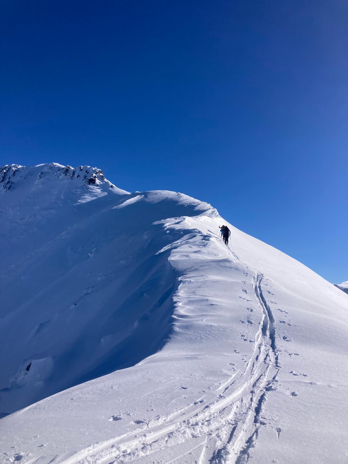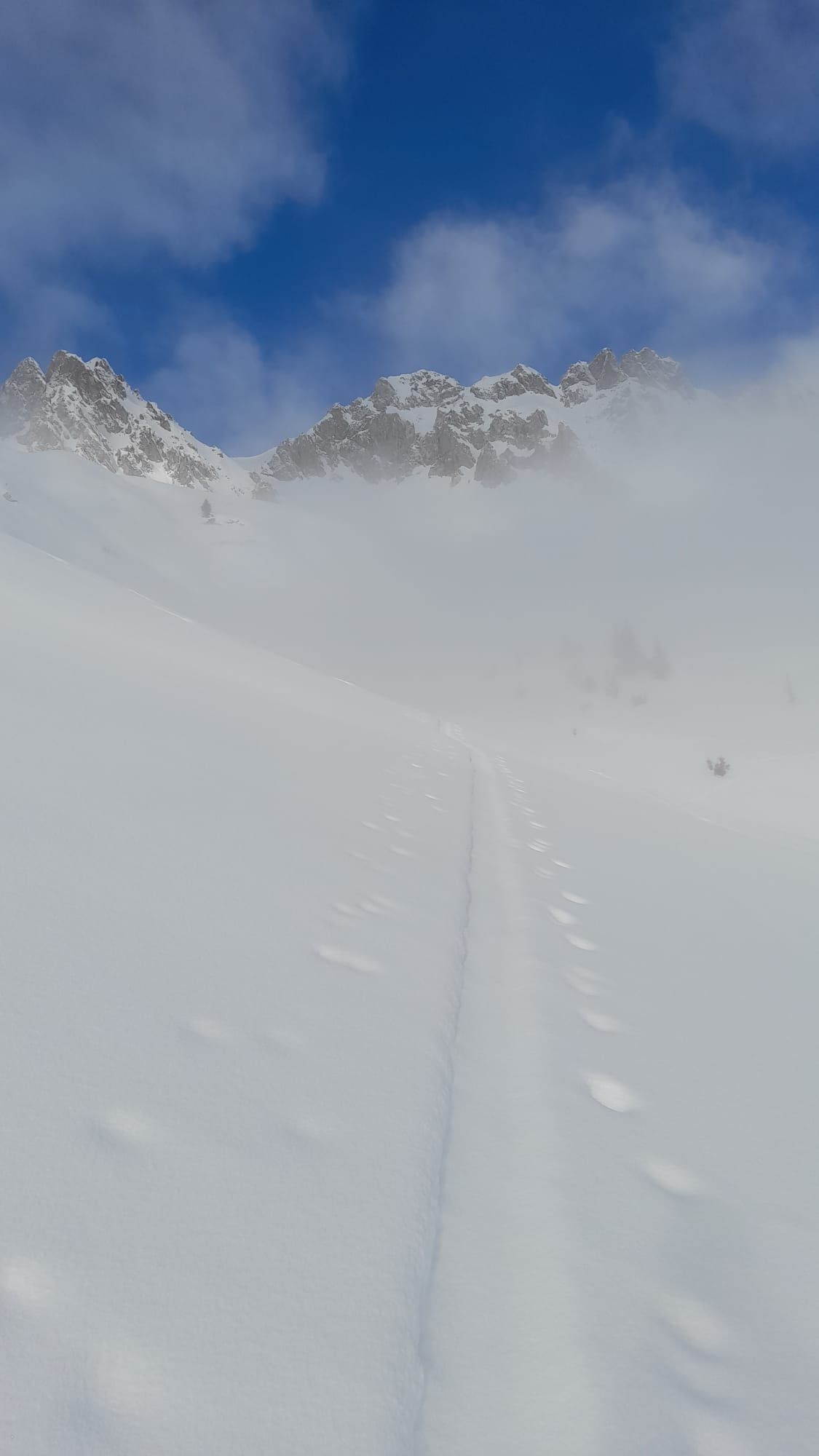Claire insiste : c'est direction le sommet et c’est une bonne chose, car on décide de descendre droit dans la pente nord-ouest. Alice avait repéré quelqu’un sur Skitour qui l’avait faite récemment. Après une petite descente en escalier entre les rochers, on trouve une large pente bien raide avec de la bonne poudre, juste un peu cartonnée par endroit.