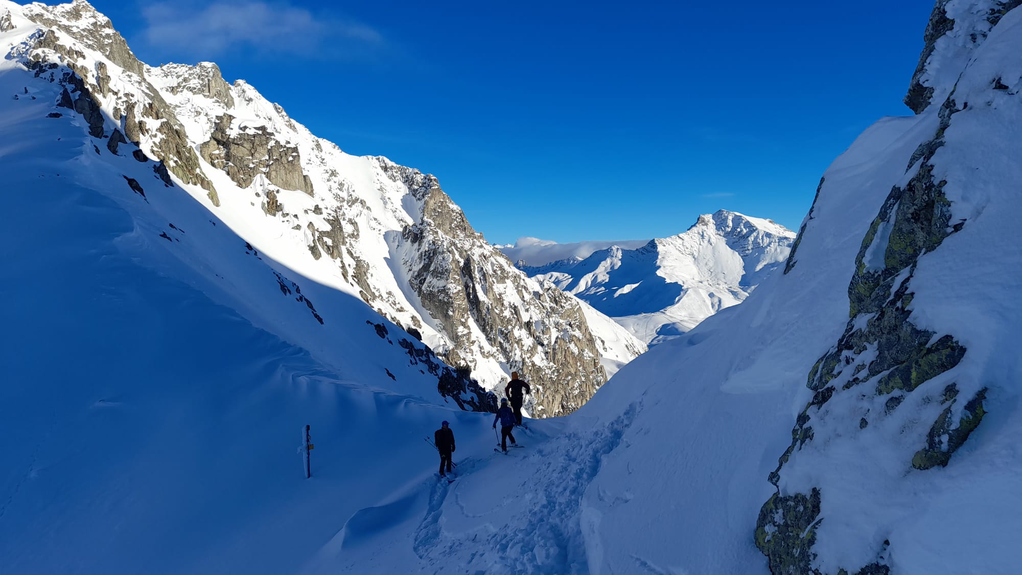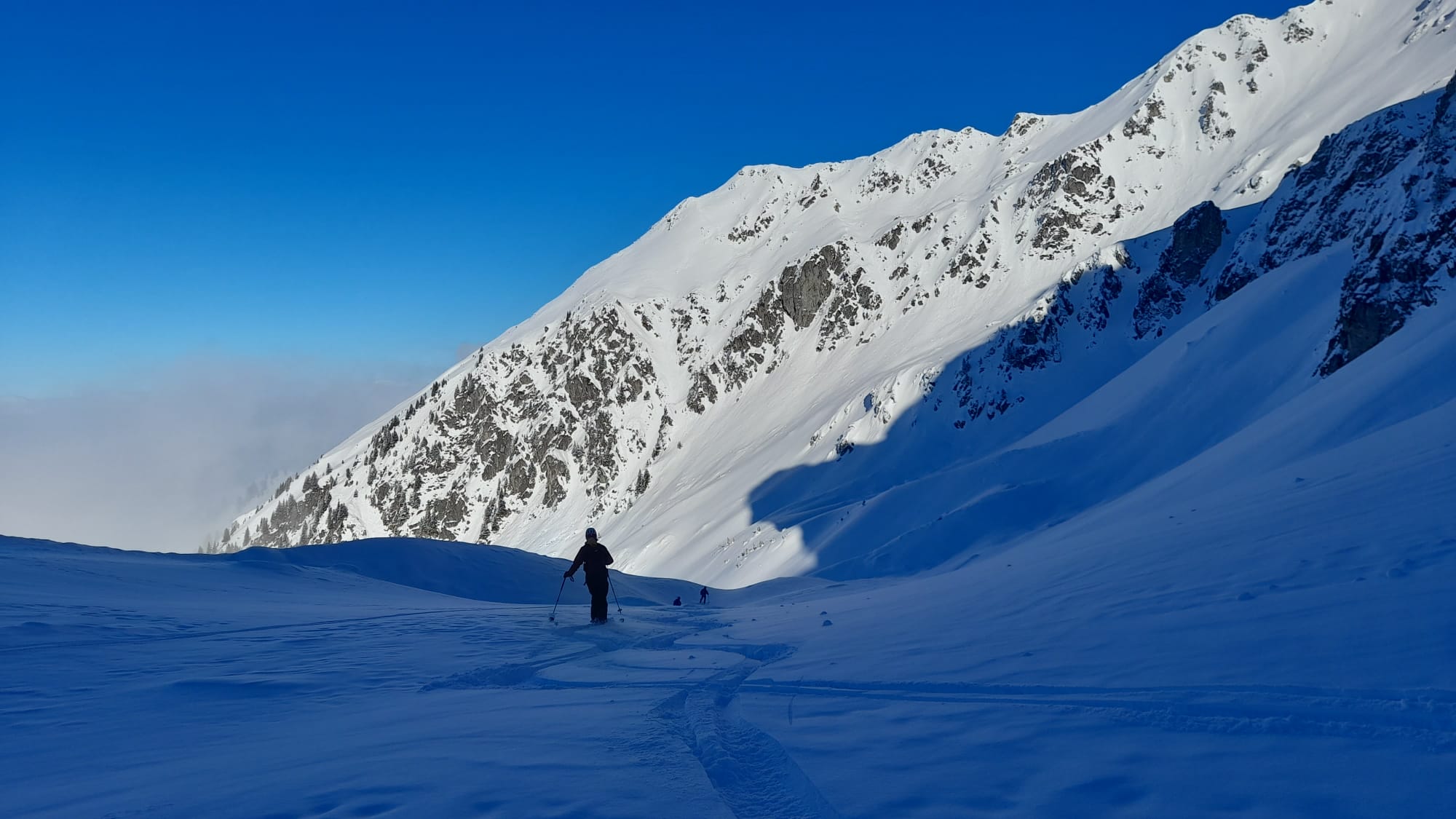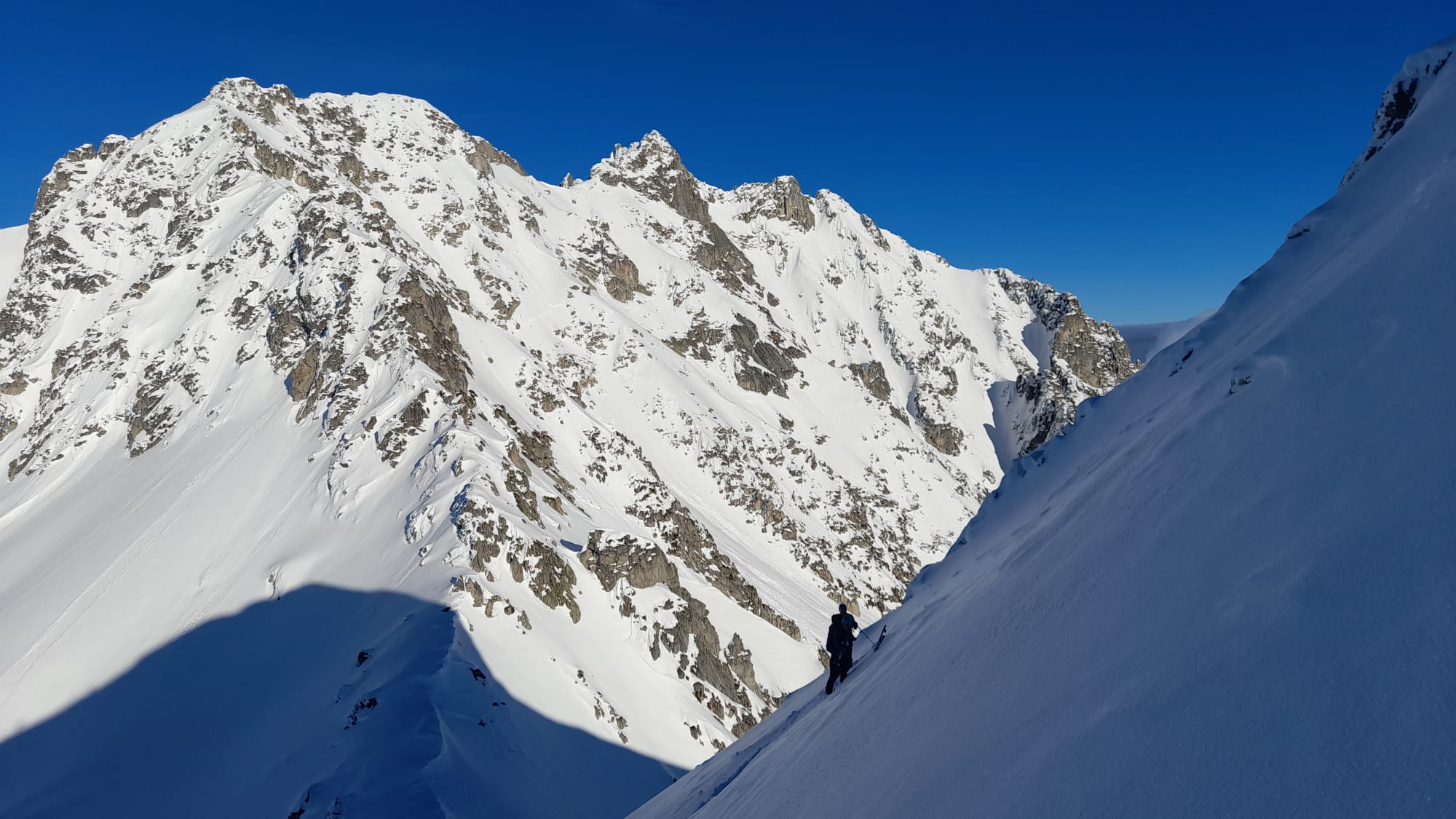La remontée est rude, mais grandiose, dans un vallon où on est seul au monde, d’abord à l’ombre et dans le froid, puis au soleil dans des pentes de plus en plus raides qui vont nécessiter quelques conversions un peu acrobatiques.