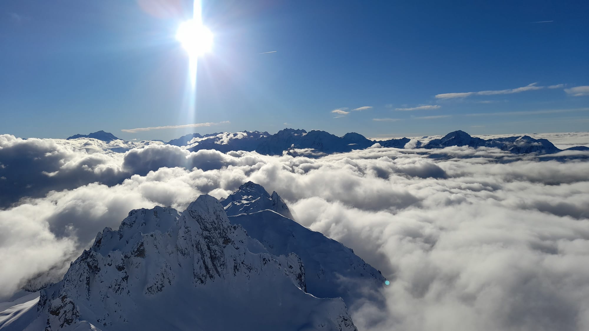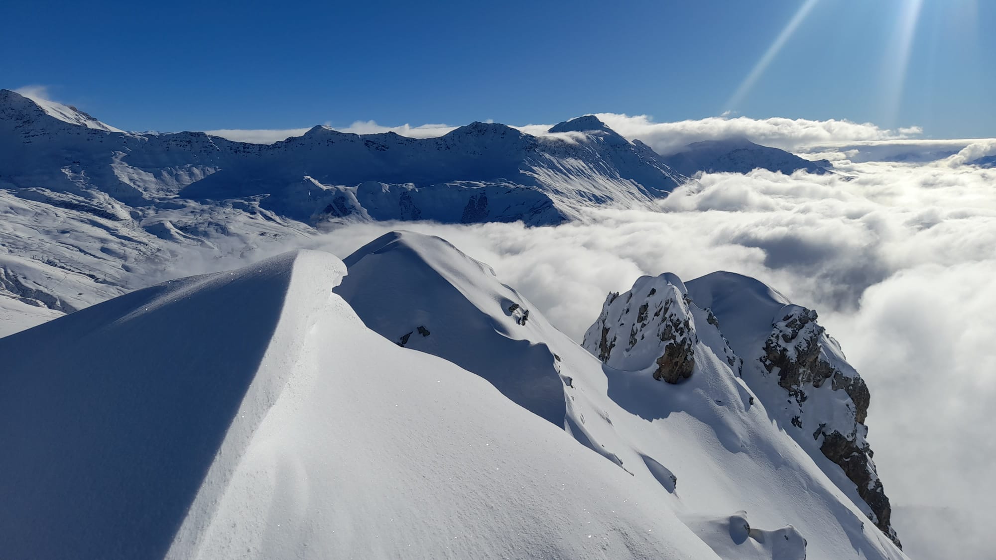 On débouche enfin sur l’arête du Sarvatan où il nous reste une petite grimpette pour atteindre le sommet avec vue sur la mer de nuages et les ilots de sommets qui dépassent.
