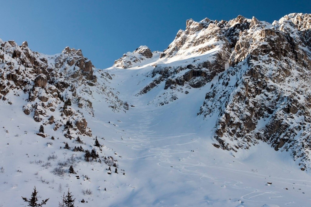 La descente n'est pas finie et la poudre est présente en abondance. Nous délimitons deux lignes à ne pas dépasser, une à droite pour les cailloux, Chloë s'y colle, l’autre à gauche, pour une éventuelle plaque sous des pentes dominantes, Loïc c'est pour toi.