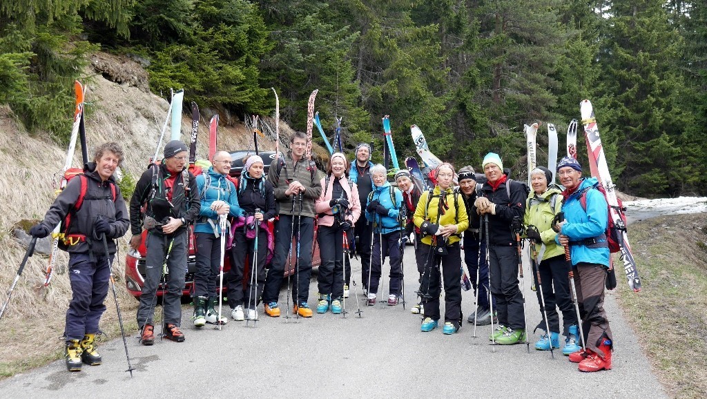 Nous étions 15 au départ de la côte d'Aime samedi matin. Le Week-end avait été annulé en Mars pour cause de conditions météo exécrables. La météo de ce WE est un peu plus clémente mais c'est pas le beau temps ! Nous partons confiants et pleins d'enthousiame tout de même. De toute façon comme dirait Jean, qui regarde trop la météo, passe son WE au bistrot. Départ du parking des Pars. La neige a bien reculé et nous partons skis sur le sac.