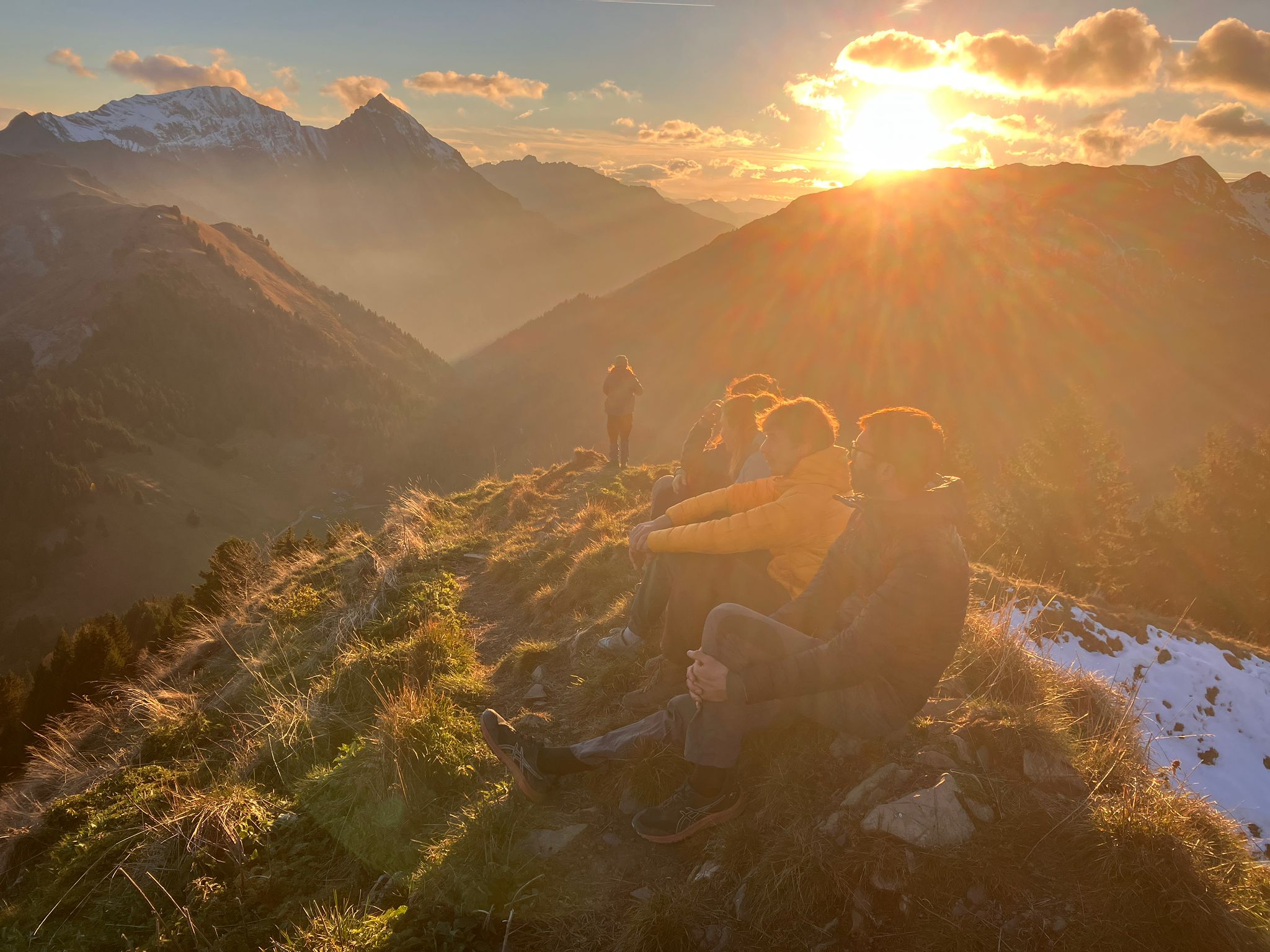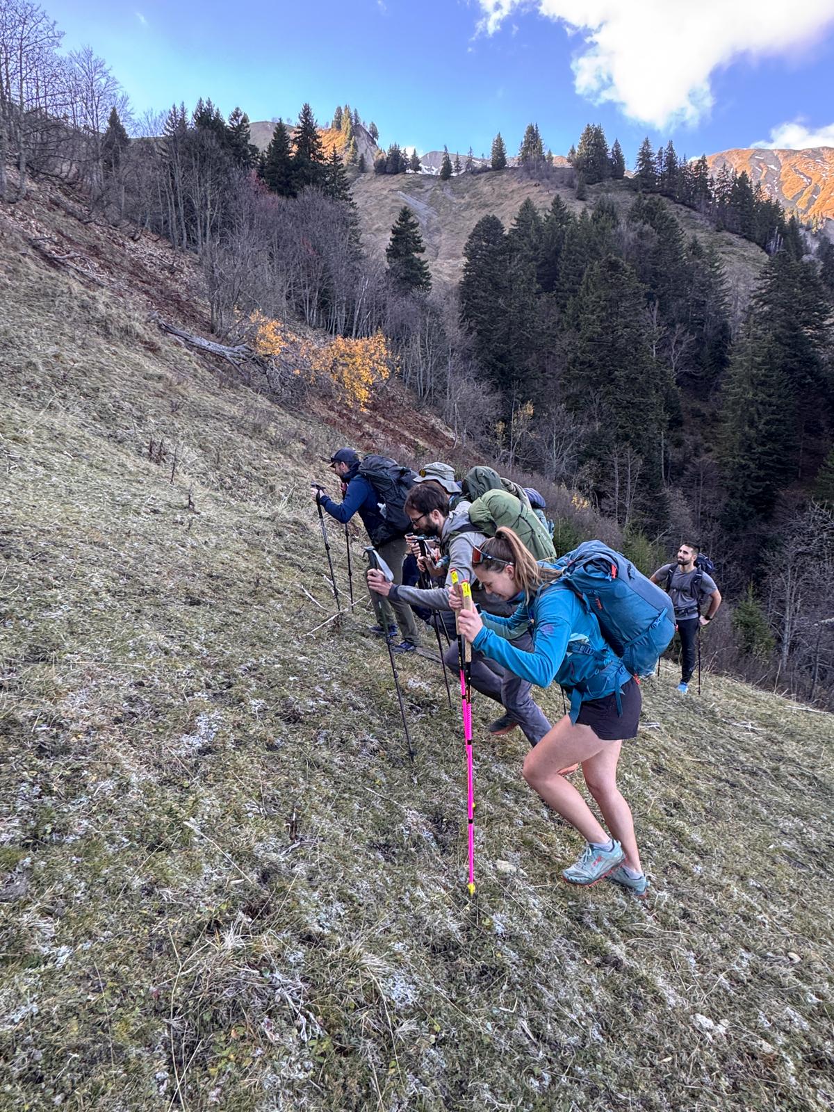 Le départ est donné au col de Tamié, terrain parfait pour faire connaissance et régler les sacs. L’itinéraire mène l’équipe en direction du chalet du Drison, sous un couvert de sapins baigné de lumière. Une mise en jambe douce, presque trompeuse, avant qu’une poignée d’esprits joueurs ne lance une course de 200 mètres à flanc de montagne, juste avant notre arrivée au chalet où nous passerions la nuit.
