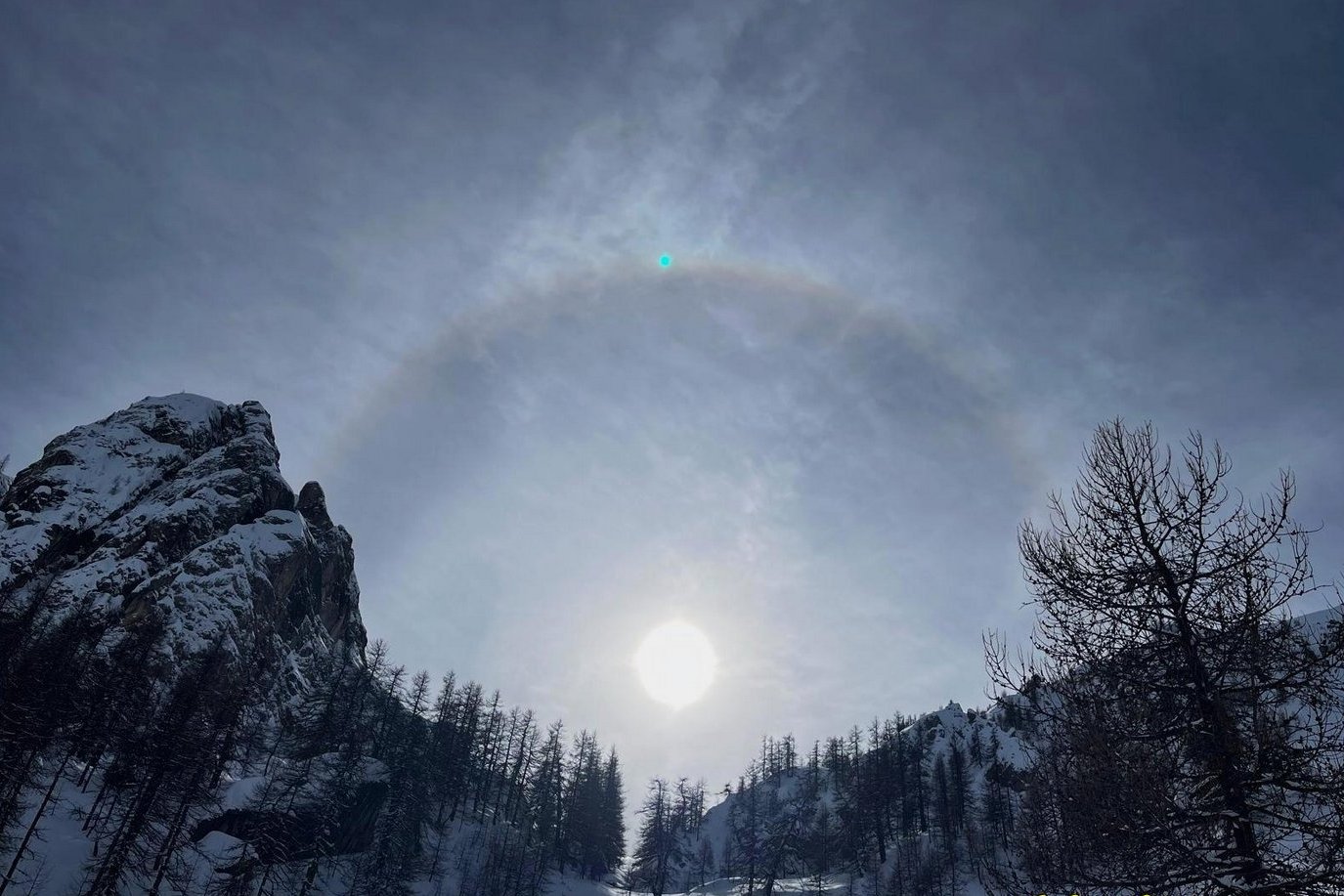 Un halo de soleil au col de la Trancoulette : phénomène optique autour du soleil, lié à la réfraction de la lumière du soleil dans des cristaux de glace présents dans les nuages. Conditions : présence d'un ciel voilé par des nuages très hauts contenant des cristaux hexagonaux.