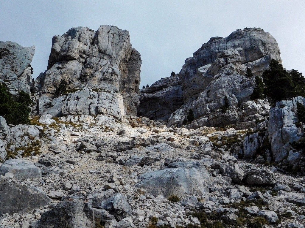 Revenons à nos chamechaudeurs du jour. Il n'y a point de passage "secret" sur les sentiers, nous nous empressons de quitter celui sur lequel nous sommes, pour nous élever vers le Sud et rendre visite à l'arche triple, joli architecture à trois piliers, où visiblement les chamois ont leurs quartiers, odeurs à l'appui.