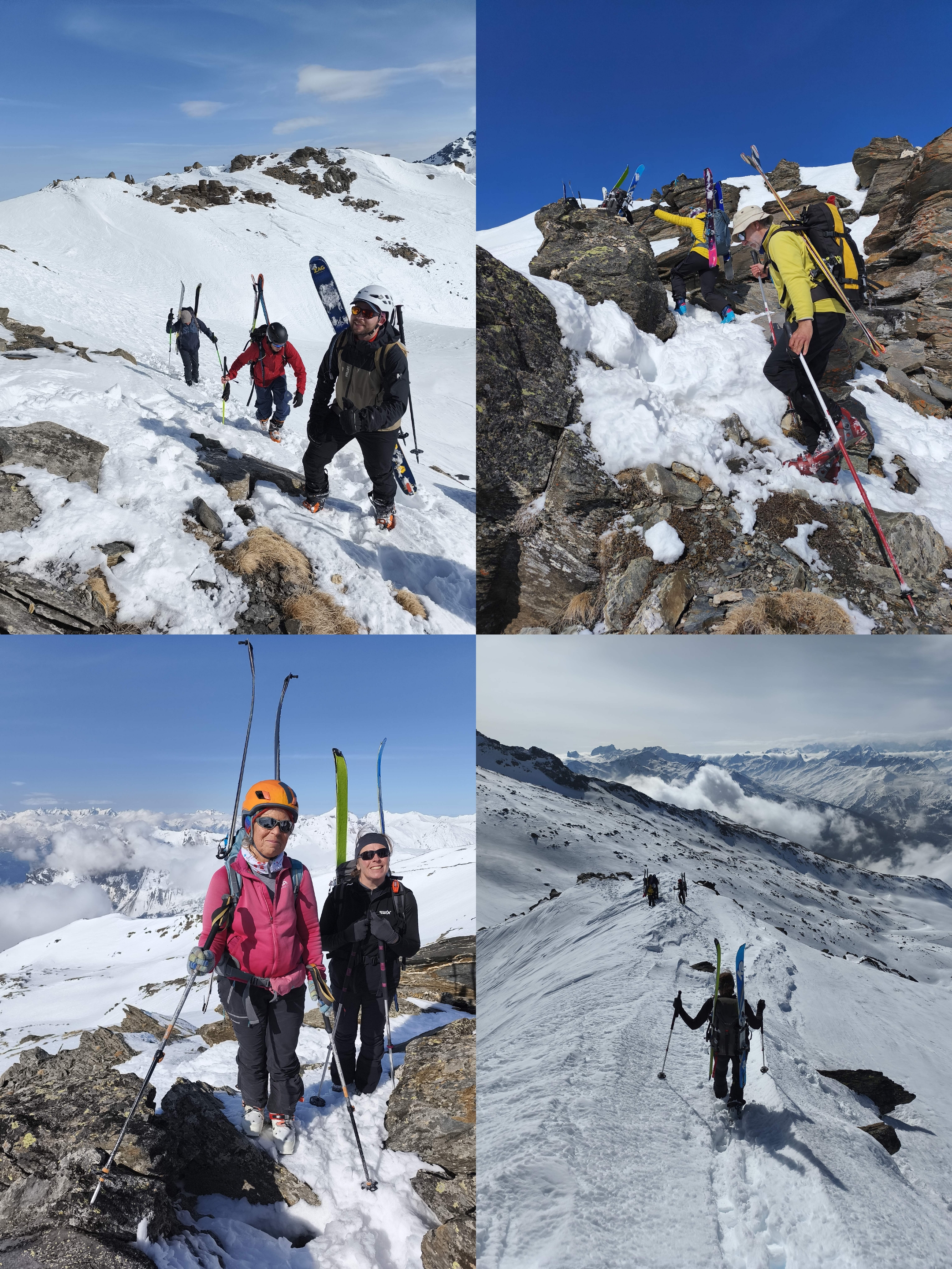 Après 3h30 de montée, le groupe arrive au Col de la Vallée Etroite (2730m). Le Mont du Chat lui fait de l'oeil, il est encore tôt, et après une discussion sur l'état de la troupe, le groupe décide collectivement de continuer jusqu'à l'antécime (environ 70d+ supplémentaire). “Parce qu'un sommet, c'est mieux qu'un col” diront certains, quand d'autres rétorqueront “ce n'est pas le but qui est important, mais le chemin”. Les Cafistes n'ont pas que des jambes, ils ont aussi une tête ;). Les skis sont donc accrochés sur les sacs, et 30 min plus tard, tous les participants arrivent au sommet et admirent la vue.