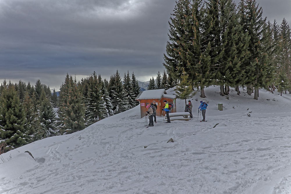 La route étant bien dégagée jusqu’au Mollaret, nous partons depuis ce petit hameau, raquettes aux pieds sur le saupoudrage de neige restant, sous un ciel bien chargé.
