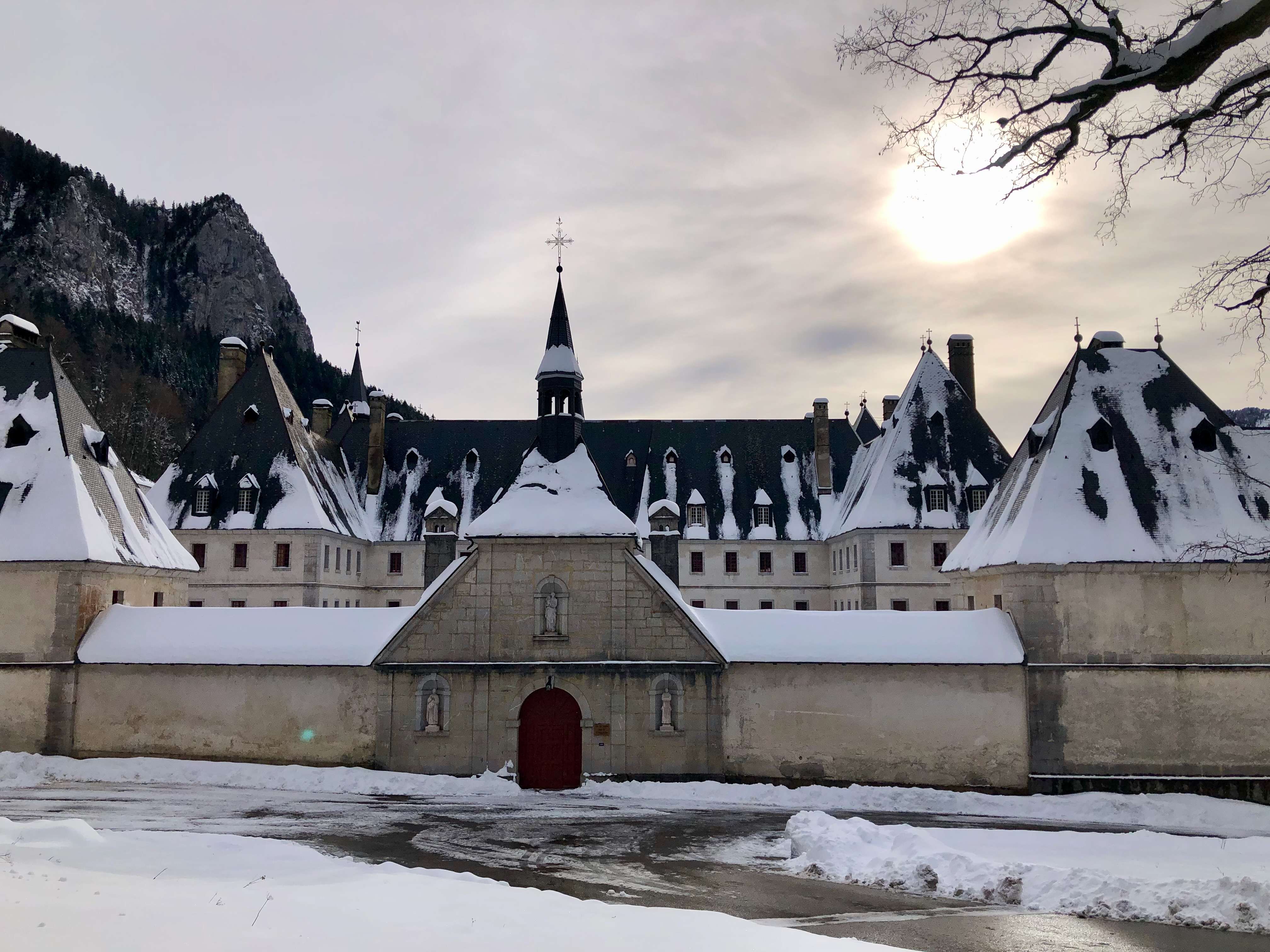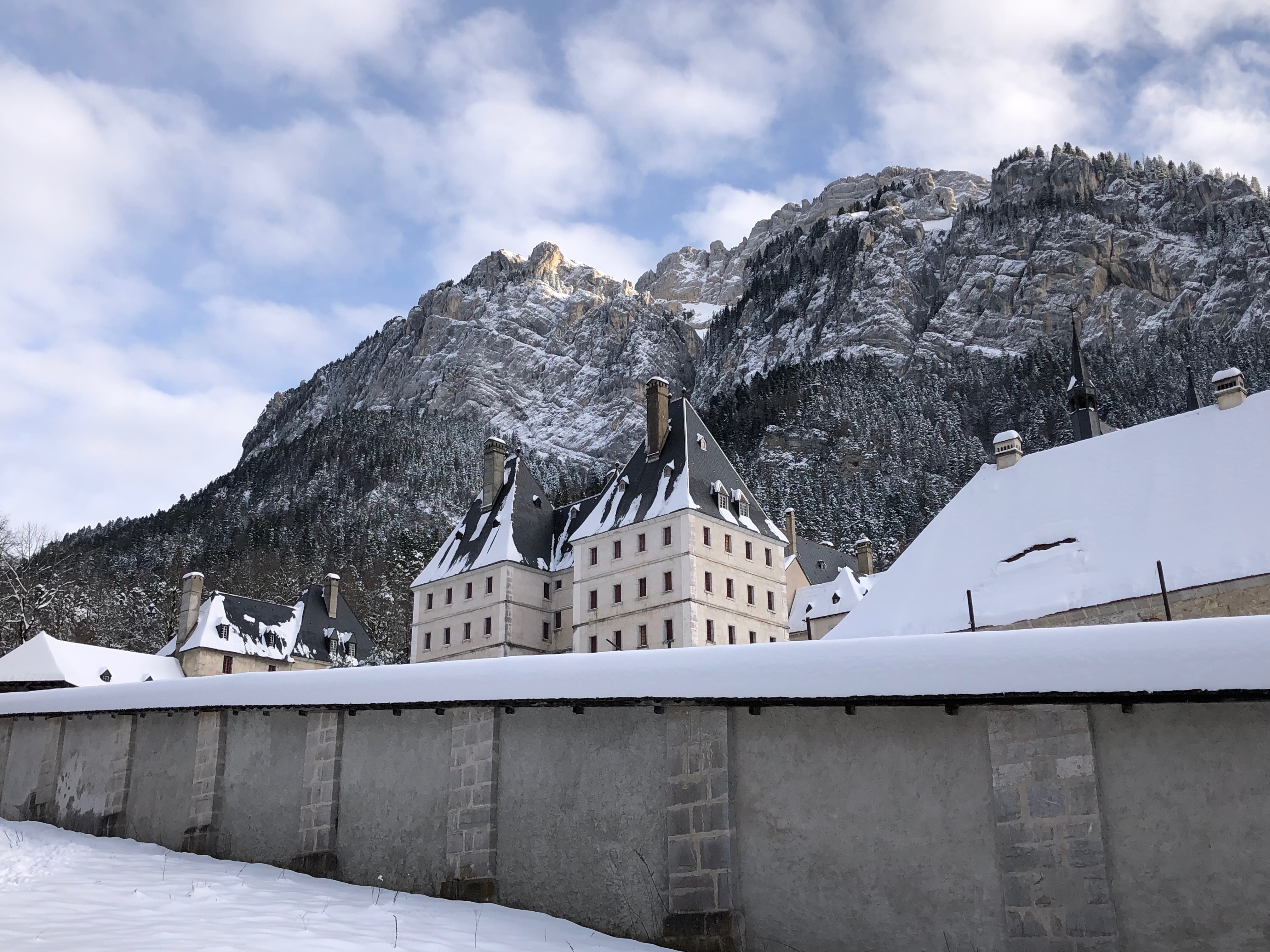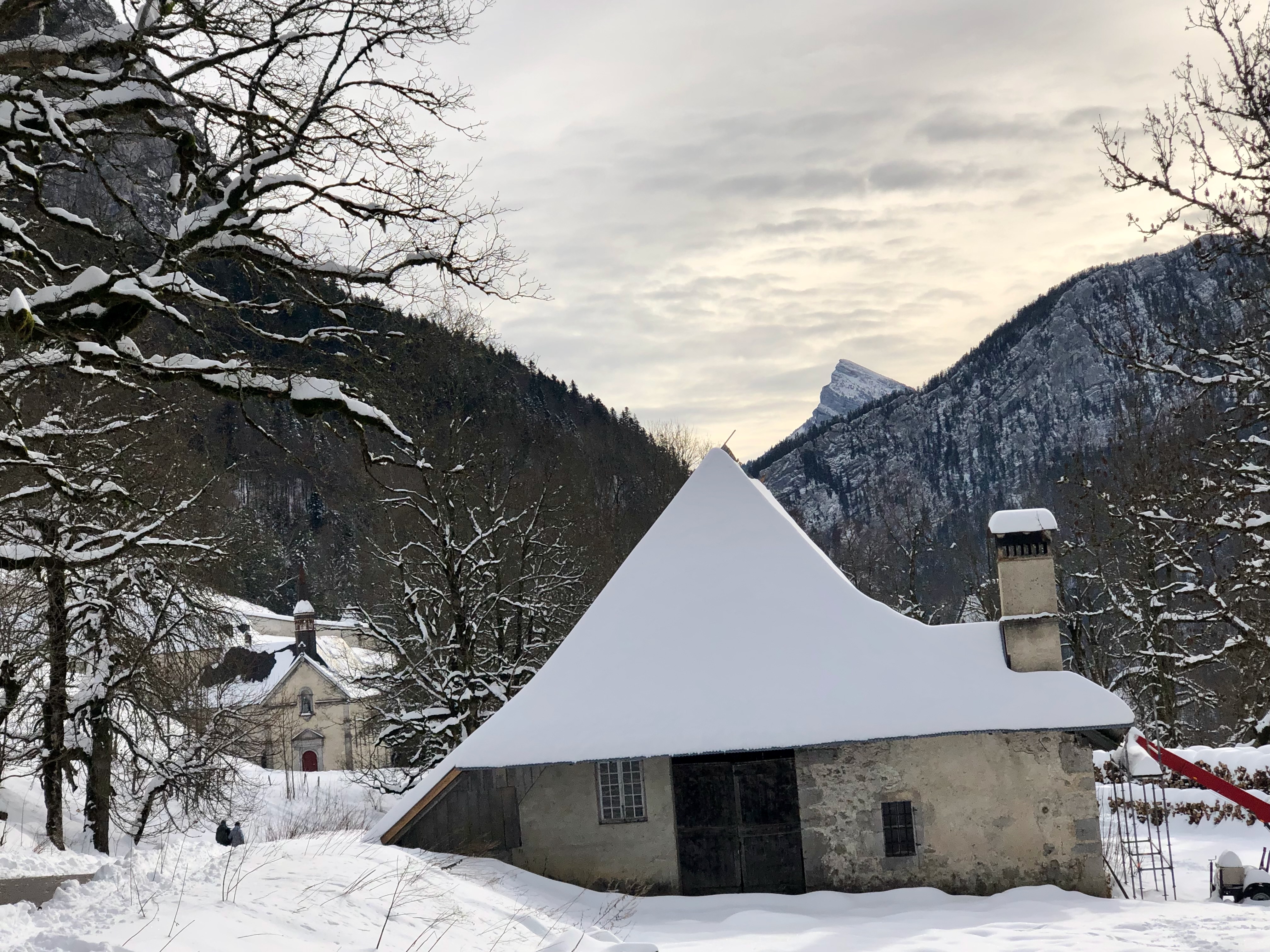Puis, au détour d’un virage, la Grande Chartreuse apparaît. Chut ! Le silence doit être roi. On s’arrête quelques instants, histoire d’immortaliser dans la boîte à images le moment, puis. Nous poursuivons afin d’emprunter la route forestière du habert de Billon. La montée est progressive et sans difficulté. Régulièrement, nous devons nous arrêter pour enlever une couche. Il fait froid, mais pas encore suffisamment pour pouvoir garder l’ensemble de nos couches.