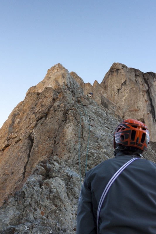 On n'est pas fatigué, donc après une bonne nuit de repos, ou presque, c'est reparti pour la Pierra Menta, cette fois direction la face E pour grimper en plein soleil. Benoit, malheureusement blessé ne regrimpera pas. Une cordée de 3, menée par Fred se lance dans la Dao Domi, avec Mickael et Clément, et Bruno et Yannick partent à l'attaque de Mendiant de Miracles, après un bon petit temps de recherche de parcours.