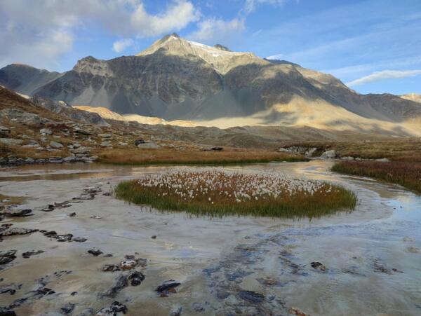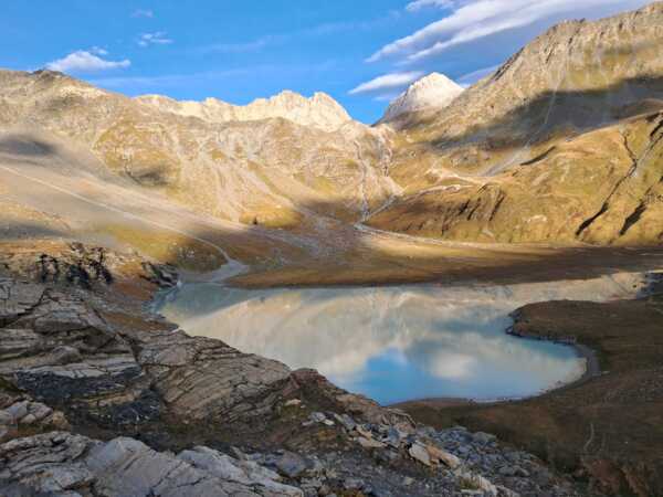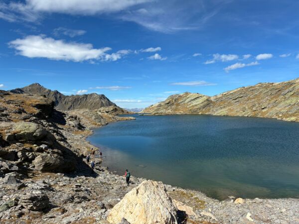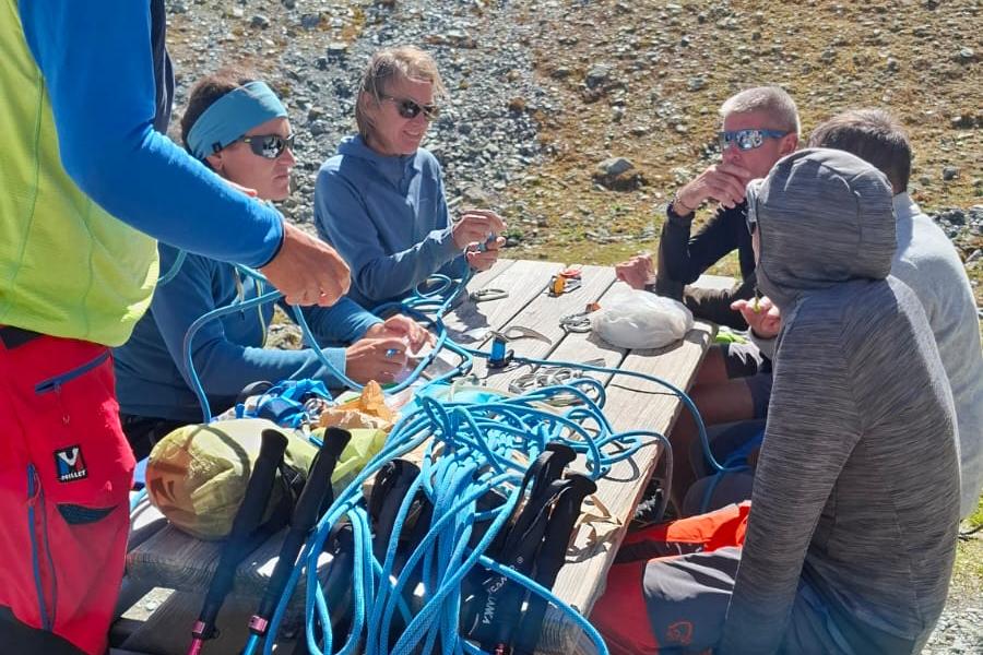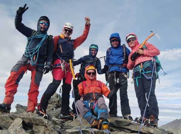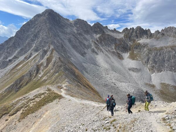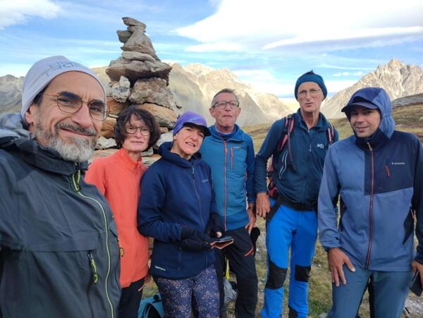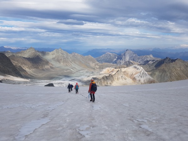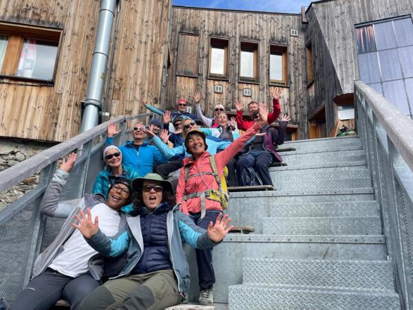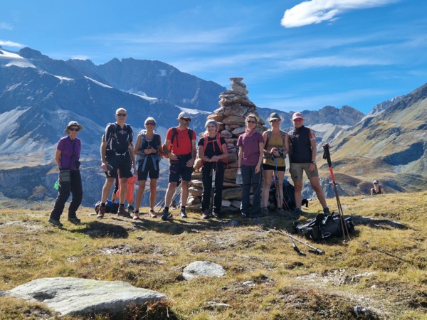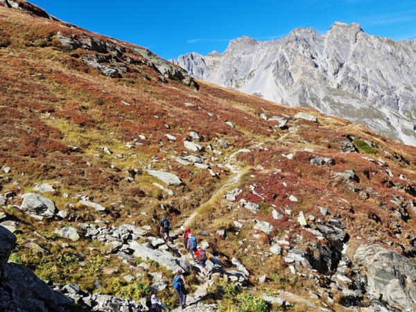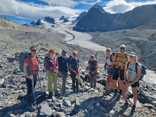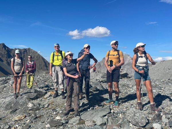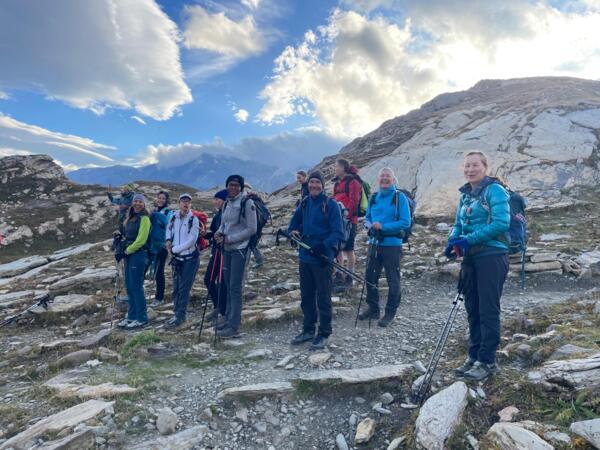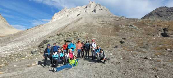 Des participants heureux de randonner dans une ambiance de haute montagne glaciaire et de parcourir une mosaîque de paysages allant de la prairie paisible au décor minéral mouvementé sous un soleil radieux.