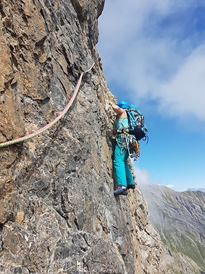 On attaque la montée des arêtes de la Nova en passant par le gendarme rouge. La roche est friable et ne tiens pas, de manière à faire regretter aux leaders d’être montés en tête. Le paysage est lunaire, presque volcanique, digne du Mordor. Au loin on aperçoit Gollum, à moins que ce ne soit l’autre cordée ?