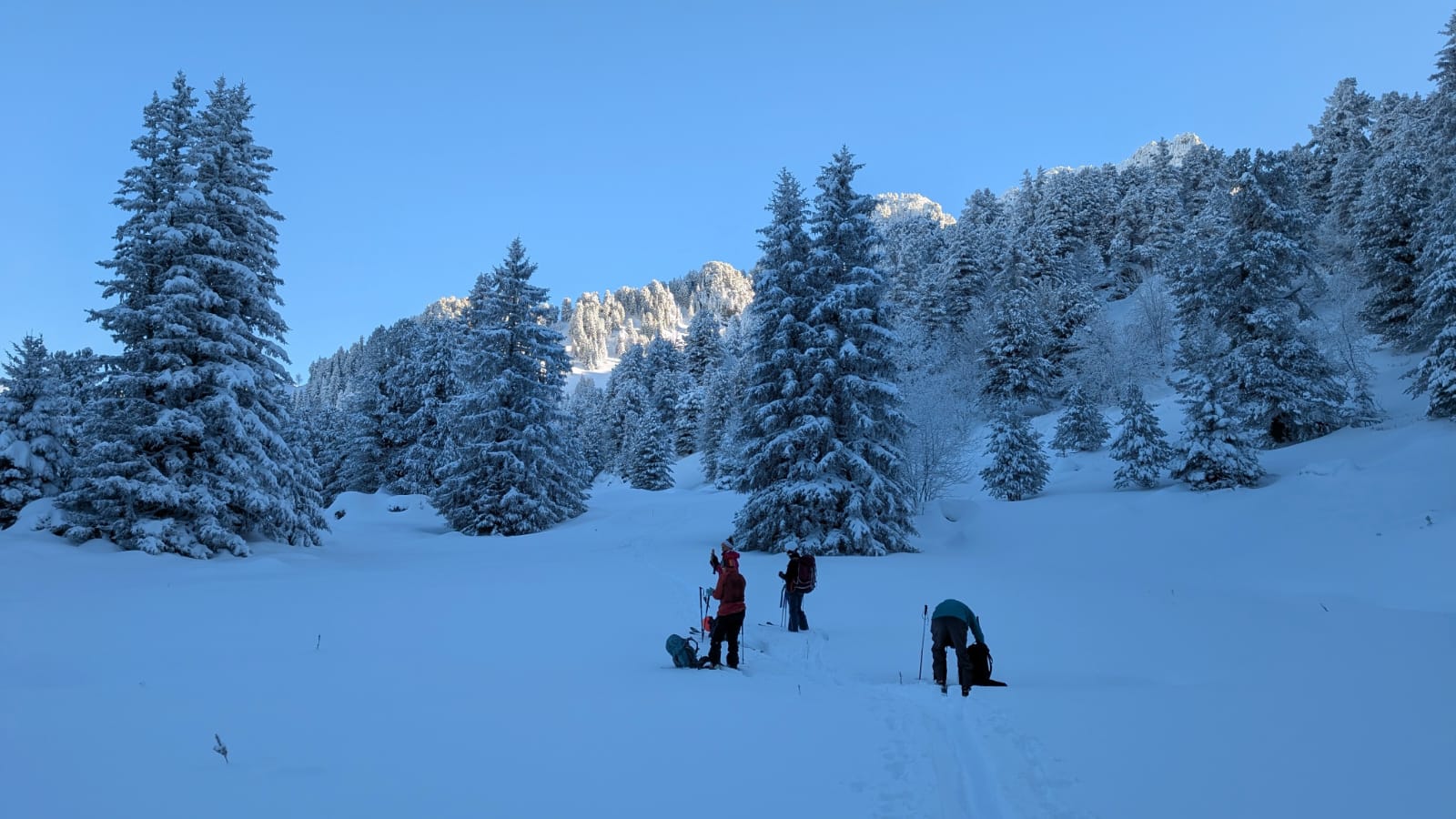 Petite sortie de reprise pour nous sur un terrain varié au départ de Casserousse (St Martin d'Uriage-1400m). Température hivernale, brouillard dense et bas, neige fraîche : on y croit ! La météo annonce un beau soleil … Très vite, nous quittons la piste de ski pour nous enfoncer dans la forêt bien chargée. Le soleil est encore loin, mais le brouillard nous abandonne vers 1800m.