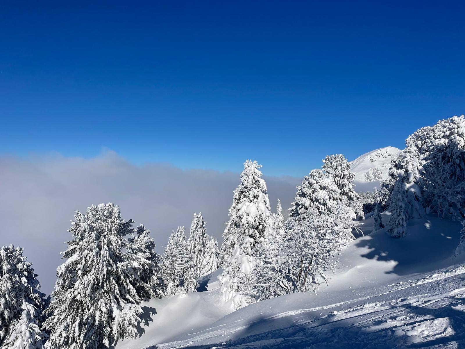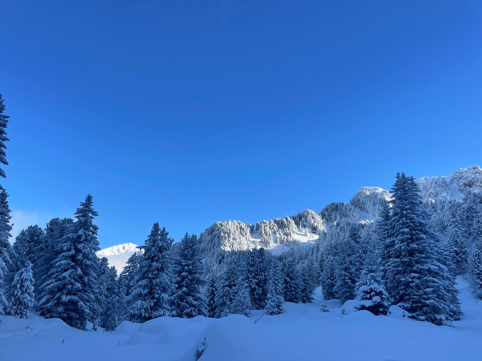 A mesure que l'on s'élève, le paysage s'élargit et dévoile des forêts recouvertes de leur manteau hivernal.