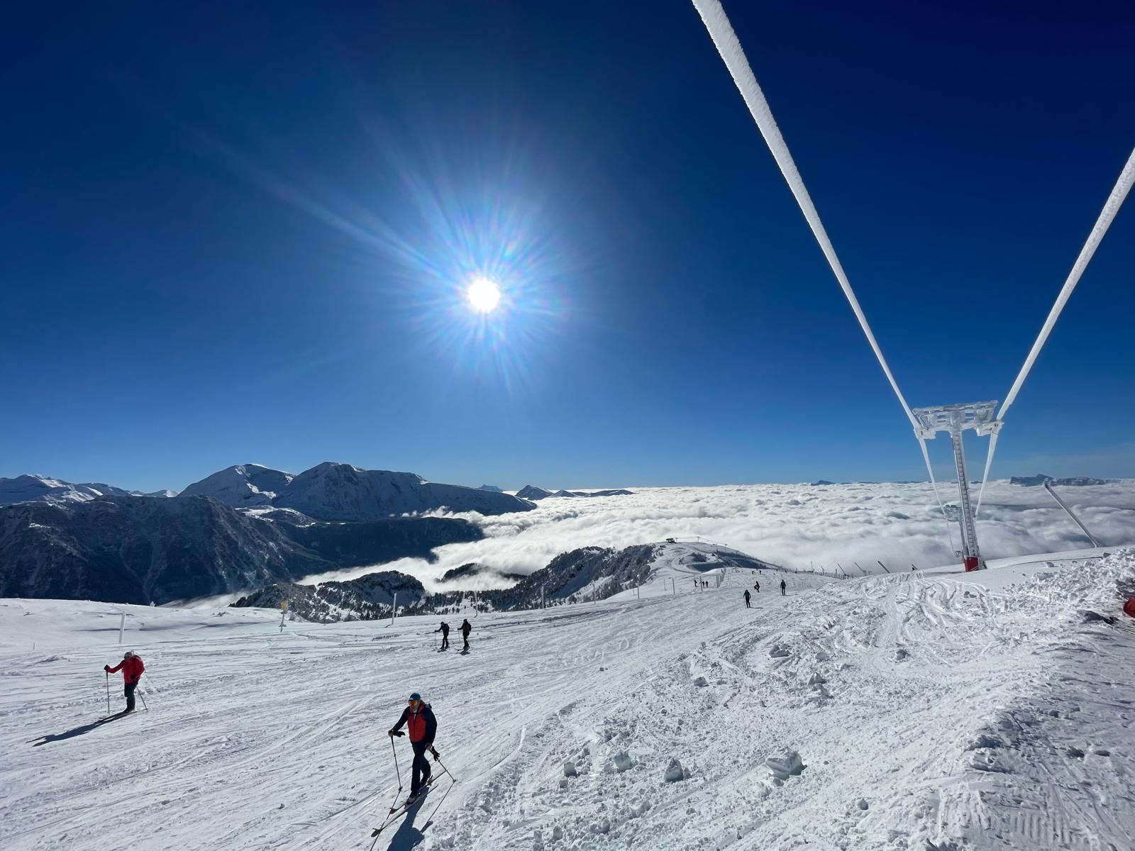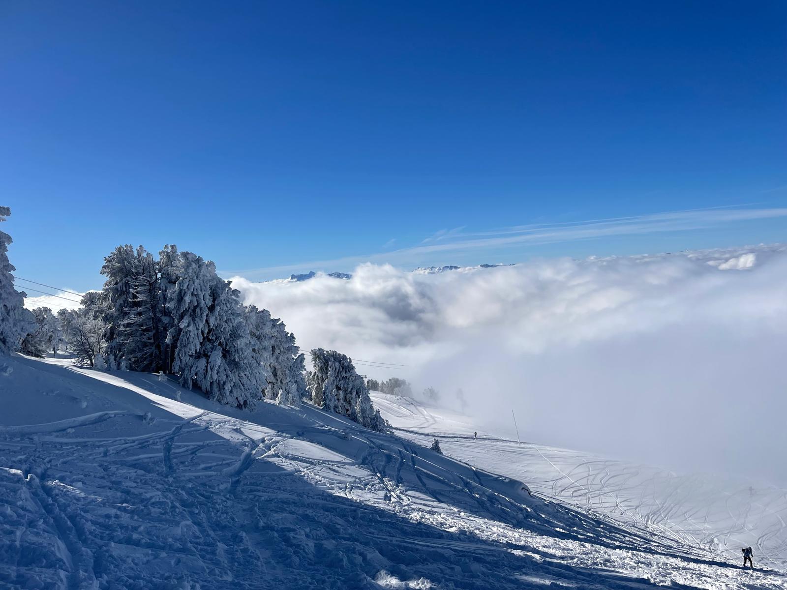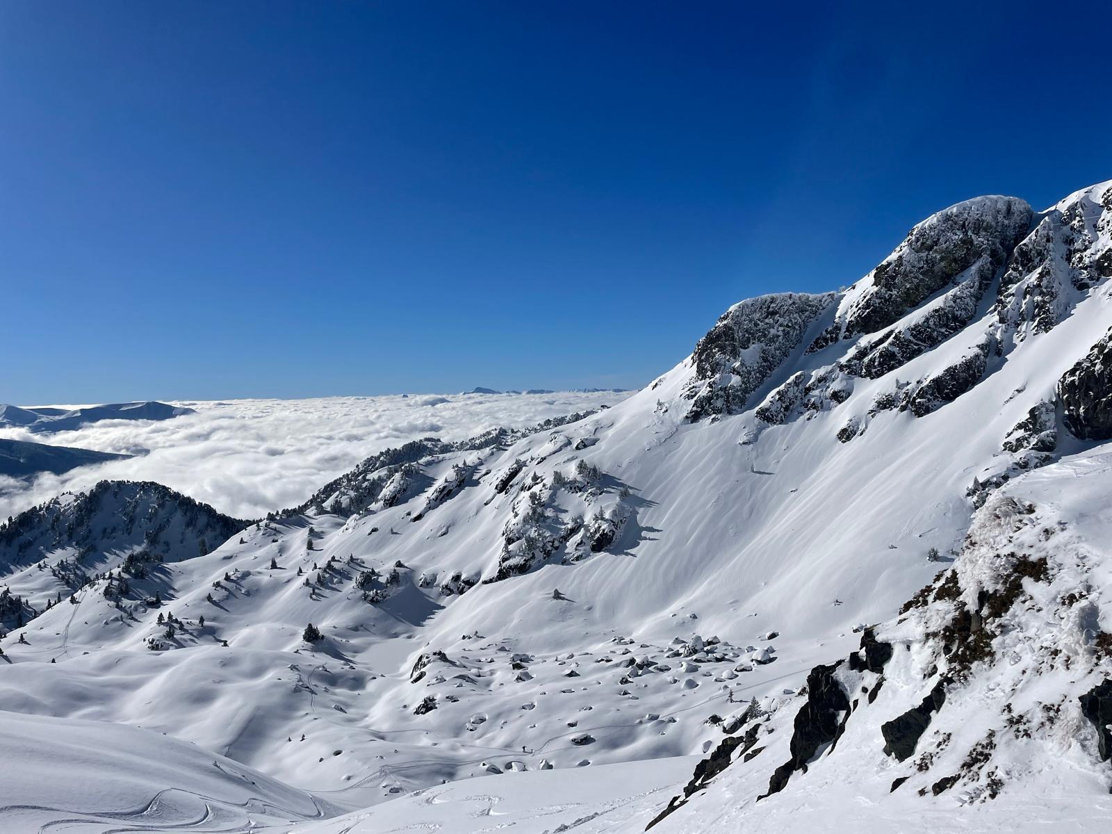 Du col des Lessines à celui de la Botte, traversée à flan de pente bien ensoleillée. Arrivés là, s'offre une vue sur la Croix de Chamrousse et le Taillefer. Au loin, le Mont Aiguille et le Grand Veymont émergent de la mer de nuages. Trop beau pour ne pas en profiter davantage : c'est l'occasion pour le pique nique. Avec une légère bise dans le dos pour ne pas s'attarder.