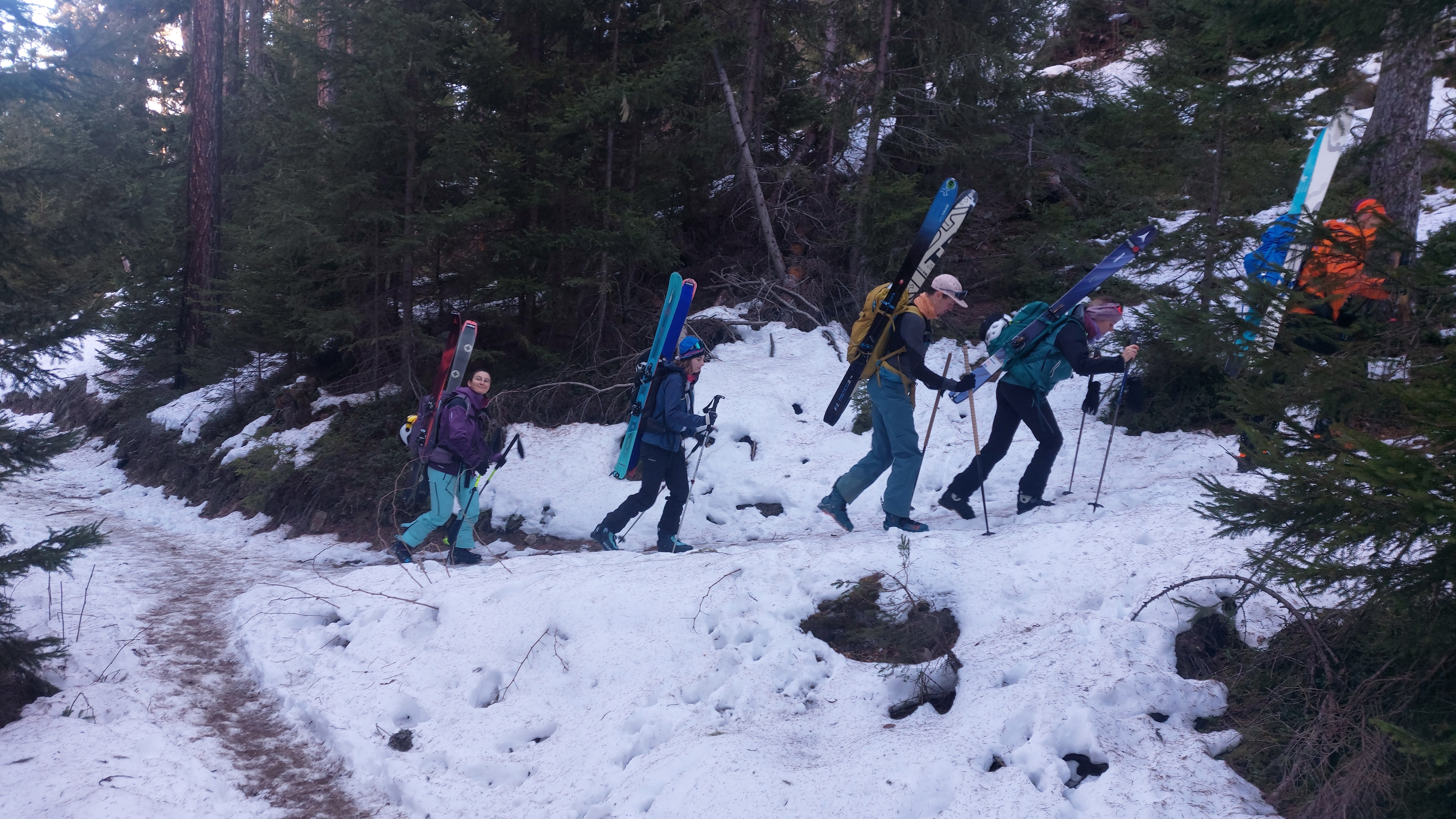 Après un démarrage dans la station de Ste Foy (1500m) chaussures aux pieds pour certains, on passe aux skis sur le début de la piste forestière bien enneigée. Enfin… la légende dit que certains ont vérifié leurs réglages de chaussures la veille…mais heureusement, un multitool aura sauvé la journée du moins aguerri de tous.