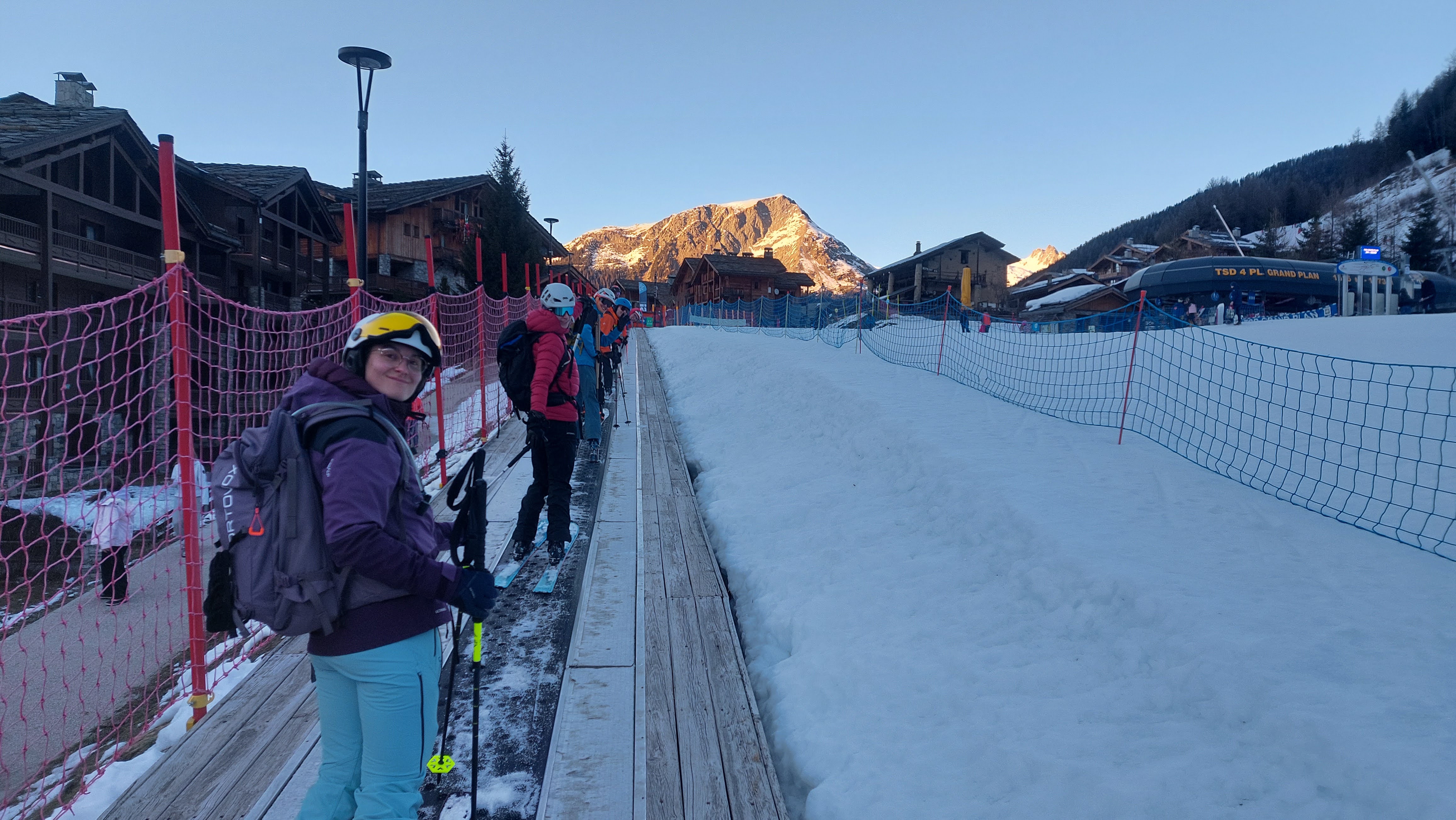 Dimanche matin, le beau temps est au rendez-vous au départ de La Rosière. Skis aux pieds, nous remontons tranquillement la longue route — presque plate — menant au col du Petit-Saint-Bernard. Ce n’est pas la partie la plus alpine de la journée, mais le cadre est agréable et l’ambiance détendue.