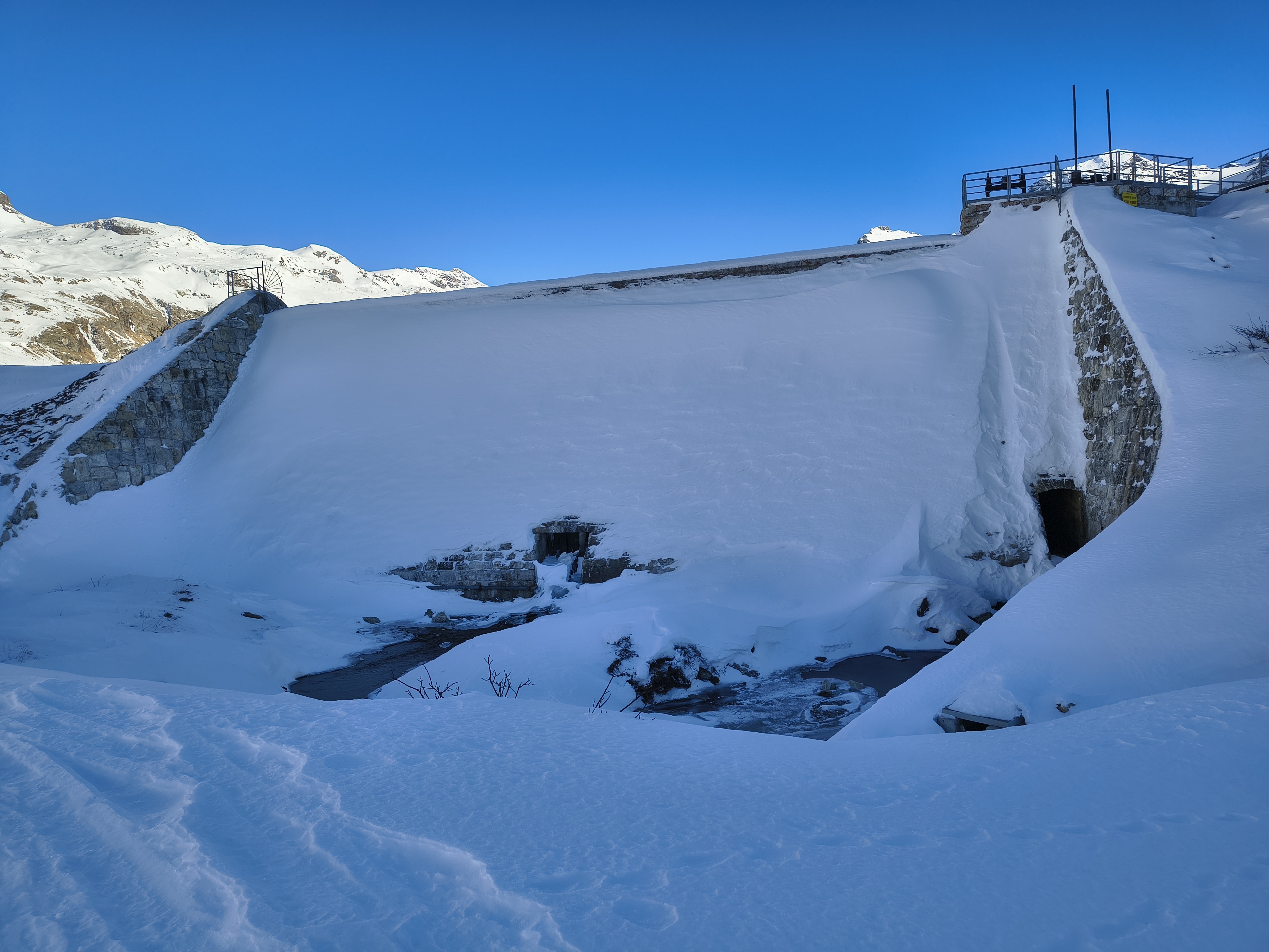 Arrivés au barrage, nous réalisons que la neige est une vieille poudreuse bien conservée, et imaginons déjà les plus folles ascensions à la Fogliette avec descentes par des vallons vierges.