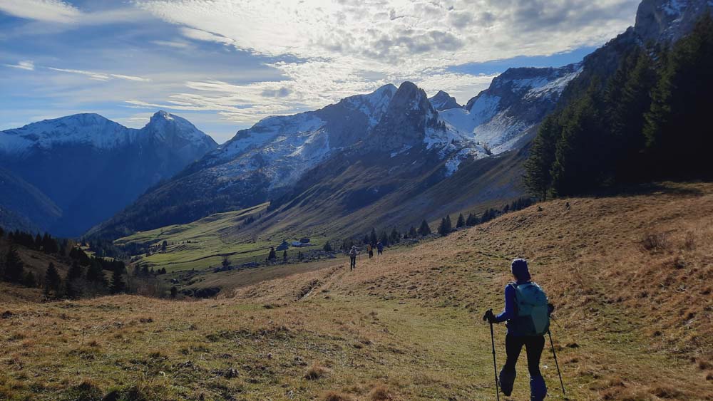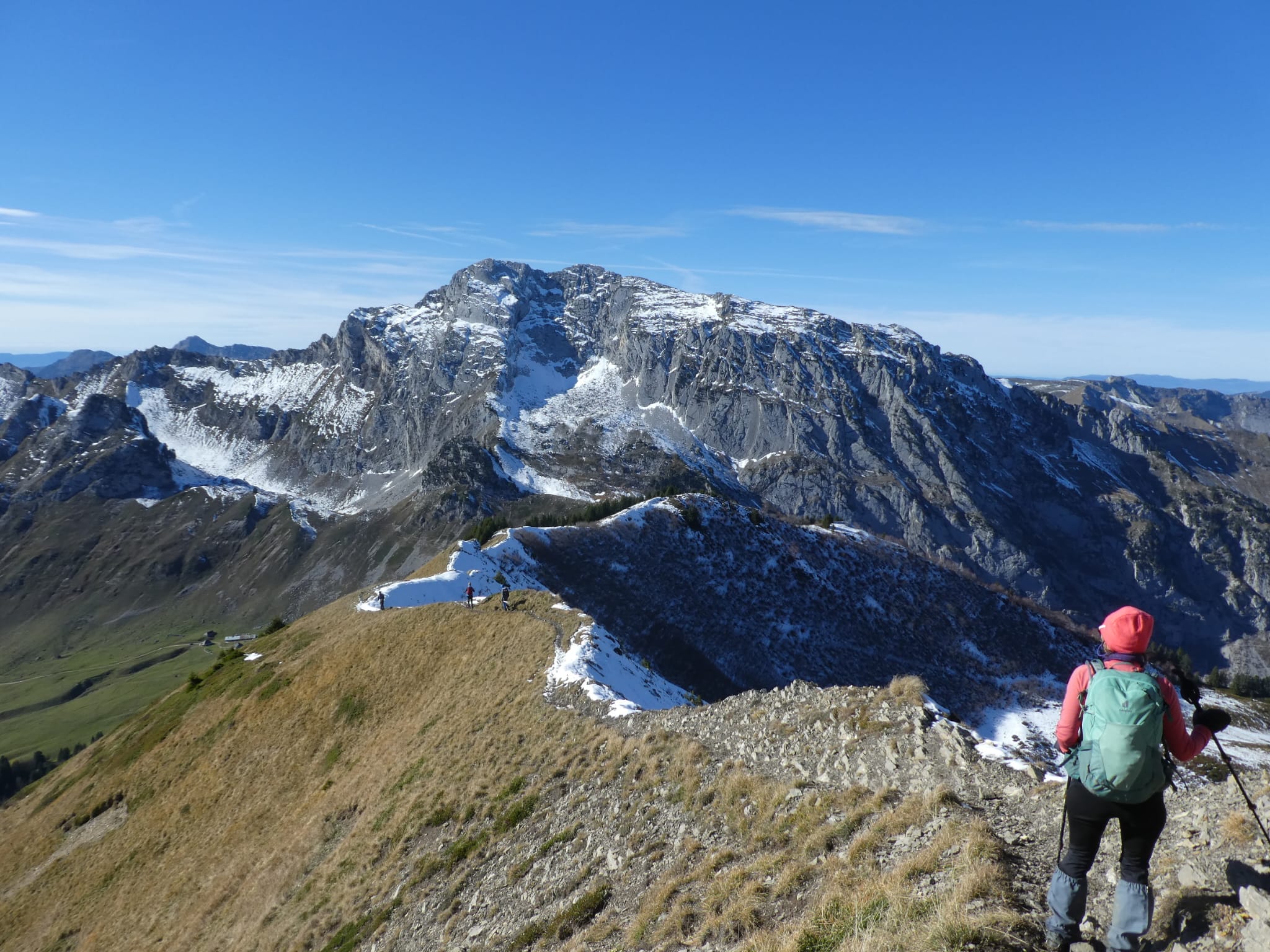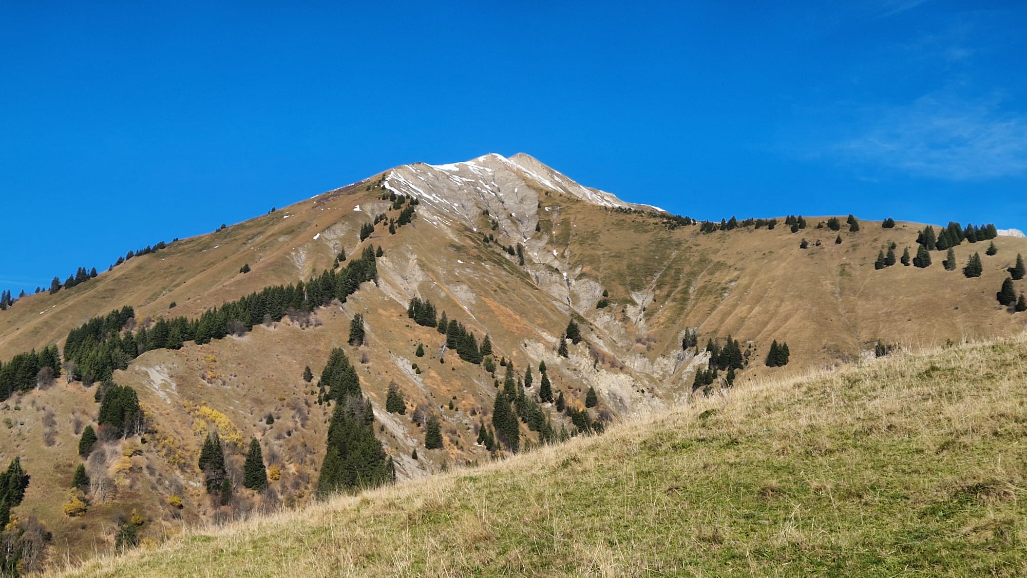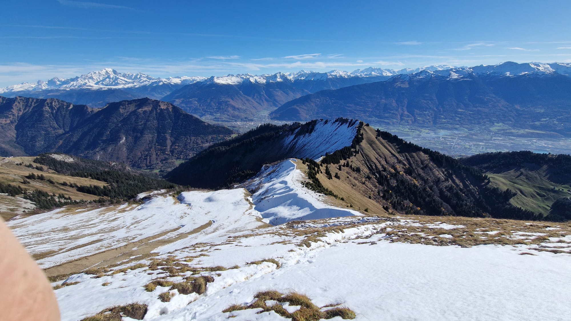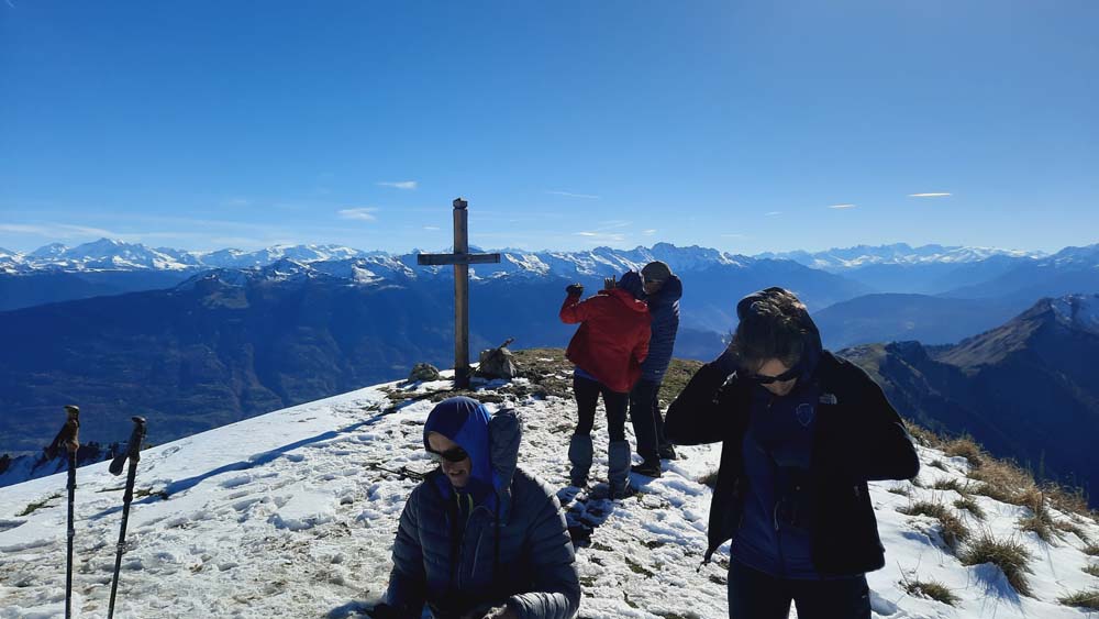 Les pentes finales sont soutenues et le cardio convenablement sollicité ! La vue à 360° du sommet est remarquable, mais le vent du jour l'est tout autant. L'air est limpide et les Bauges semblent avoir rétréci tant les sommets semblent proches.