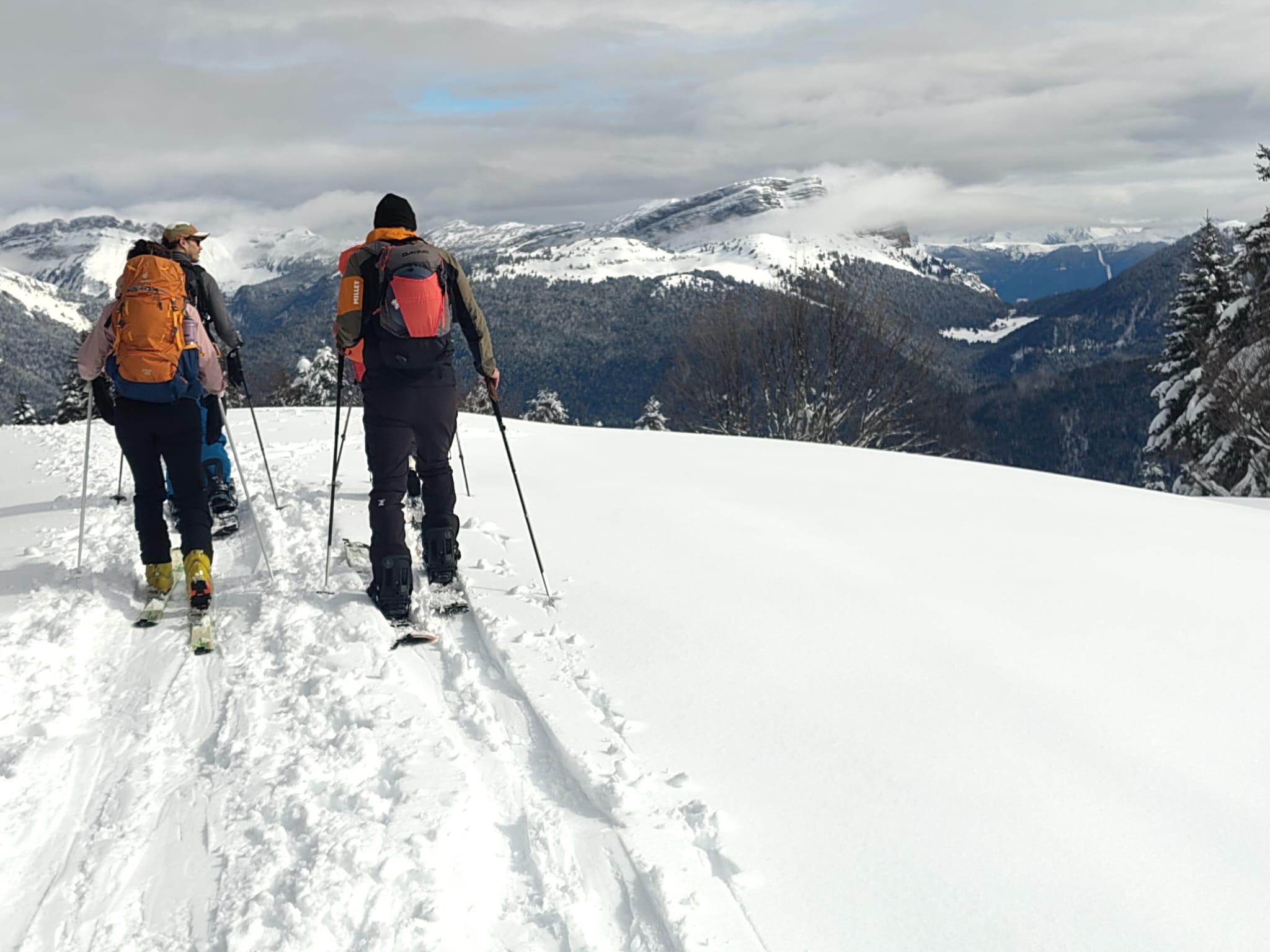 La première section se passe sans encombre hormis une perte de casque en haut d’une pente. Les spliteurs ont même réussi à suivre les skieuses dans les replats descendants (bon ok, parfois en déchaussant un peu ;)).