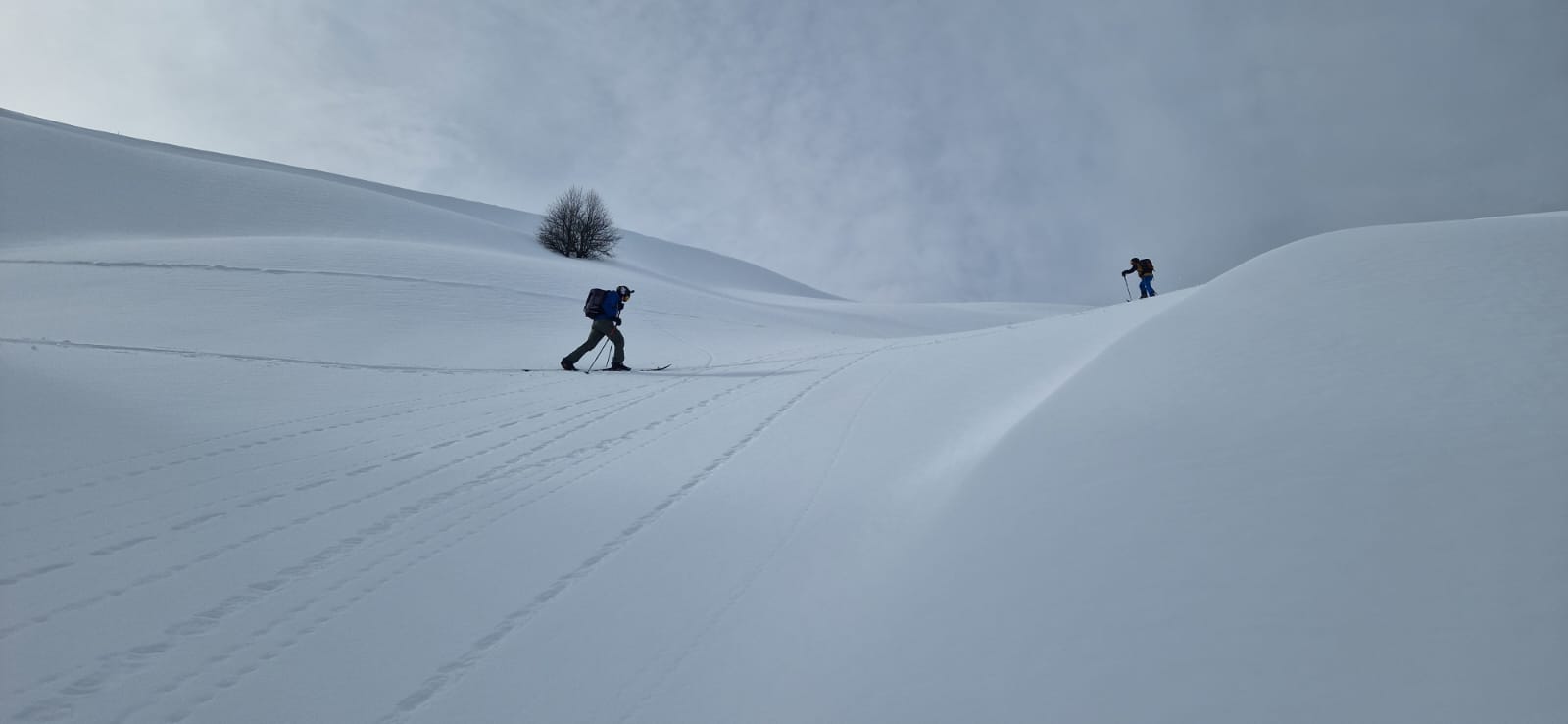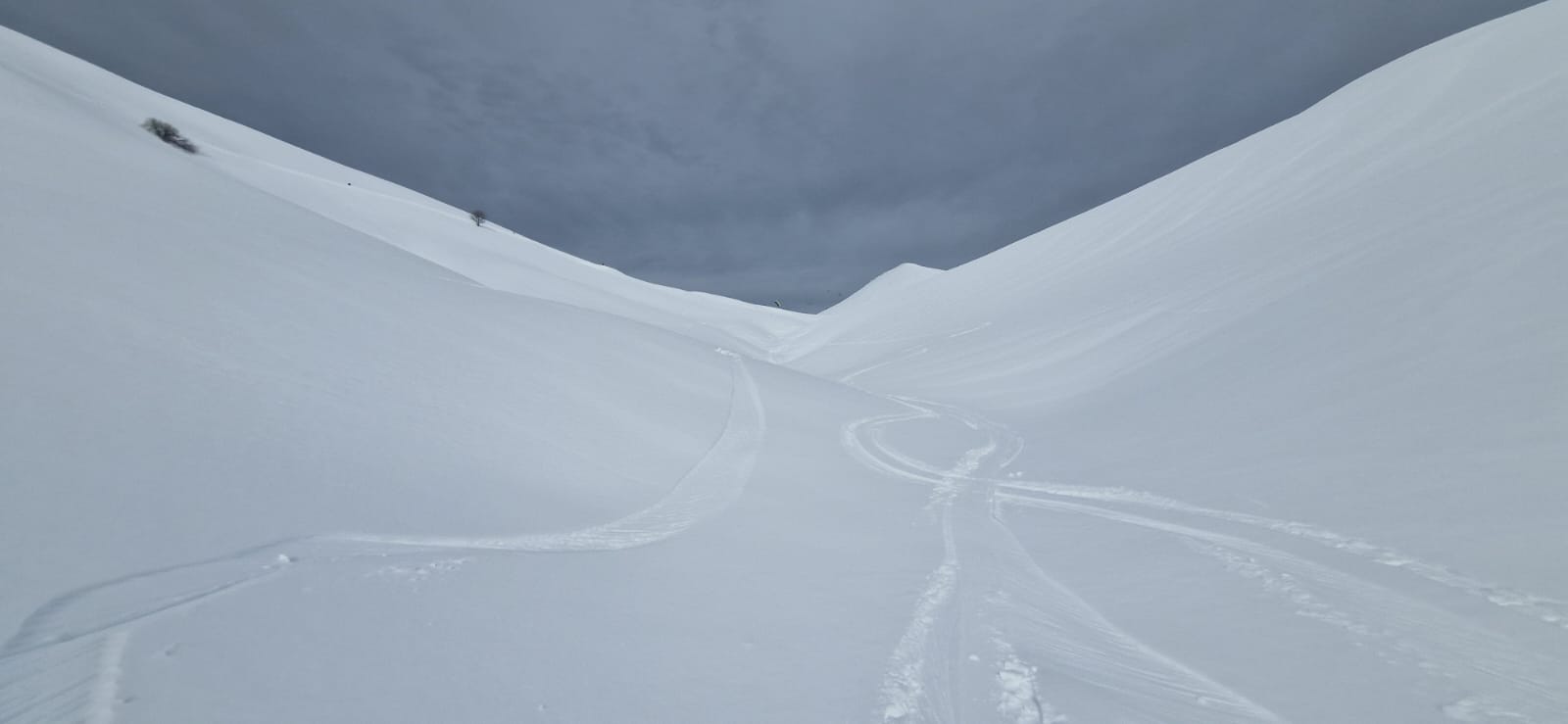 Les premiers virages sont très chouettes, dans une quinzaine de centimètre de poudre sur un fond déjà un peu plus tassé. Ils nous mènent au fond d’une combe, non sans quelque surprises du relief que le nuage du moment nous avaient cachées.